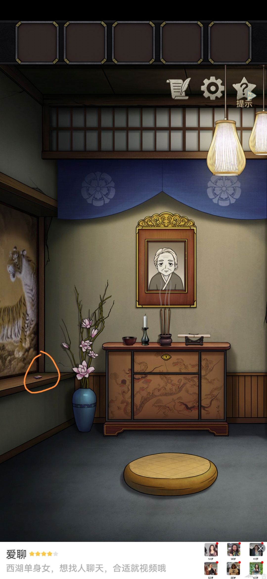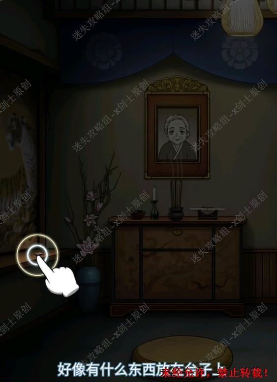 || || || 第八章 1.(游廊)点击地上的盒子,完成一笔连线小游戏 2.打开盒子,获得【玉壶】 3.(亭子)点击查看桌子上的冥币,获得线索(冥币发行的年份:平成13年-2001年) 4.点击盒子上的密码锁,根据盒顶的提示(平成1年),结合冥币上的线索,输入密码:1989 5.打开盒子,获得【鸟笛】(注意盒壁上的刻痕) 6.(游廊)点击房梁上的乌鸦,使用【鸟笛】;根据盒壁上的刻痕,按顺序吹笛,
