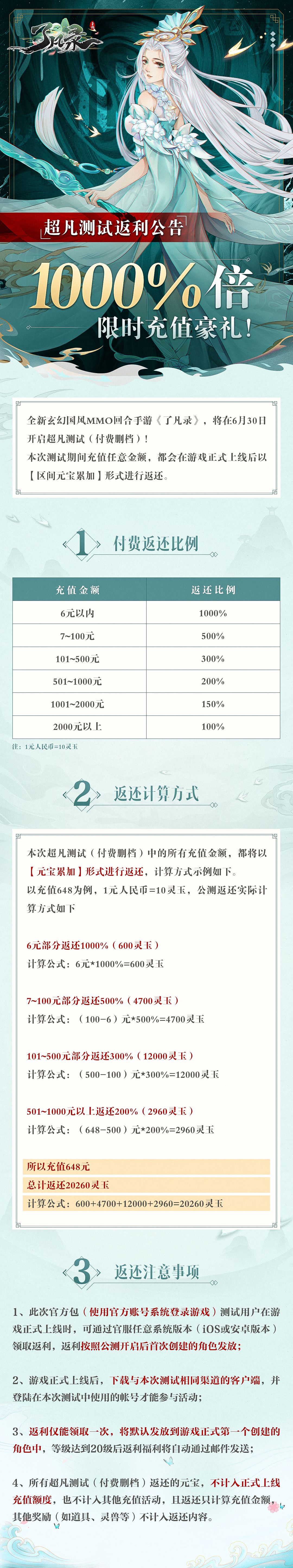 《了凡录》超凡测试(删档付费)将于6月30日开启,官方为大家准备了一大波福利,快来看看吧!详情测试信息请点击: 福利一:1000%倍限时返利参与方式:《了凡录》超凡测试中,付费即可获得游戏正式开测时的返利,返利仅能领取一次,将默认发放到游戏正式第一个创建的角色中,等级达到20级后返利福利将自动通过邮件发送。 详情见此篇帖子: 福利二:不绑神兽抽奖 参与方式:《了凡录》超凡测试中,付费即可神兽抽奖资