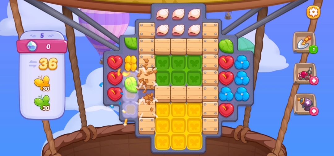 亲爱的小伙伴 小助理给大家带来了热气球联赛第五关的通关视频,希望可以帮助卡关的小伙伴们快速通关,消除不开心! 关卡目标:黄蝴蝶,绿蝴蝶关卡元素:铁钉木箱,贝壳 关卡通关小技巧: 尽快消除地图中间的木箱,中间花朵可以正常掉落后,由下至上进行相除增加花朵掉落频次。
