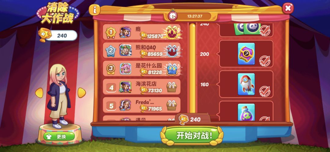 《消除大作战玩法》😎 通过游戏左侧位置看到奖杯图标为入口 点进去可以看到游戏界面 选择一位顾客,然后点开始对战,再选择任意一个道具卡牌,最后匹配对战 进入匹配页面,等待匹配对手,消除大作战采用的是三消模式,即三个同色遇一起就会自动消除 首先选择顾客,顾客拥有不同的皮肤(皮肤在魔法盒抽取),每个皮肤拥有不同的技能,大家可点左下角更换按钮自由选择 然后选择道具卡牌,每个卡牌拥有不同技能,以下为技能介绍: 炸弹:随机造成一个十字形爆炸 小飞机:消除最下方一行的元素 染色桶:随机6个元素染成同一种随机颜色 毒气弹:在选定的元素周围随机扩散消除7-13个元素 导弹:随机位置产生一个普通炸弹大小的爆炸 宝箱:随机出现三个随机特效,火箭、炸弹或闪电 喷枪:以指定位置为中心进行十字火箭消除 吸尘器:消除指定颜色的所有元素 魔法瓶:随机消除三列元素 道具卡牌可通过看广告或绿钞购买 进入对战页面,左侧为我方,框内是选择的道具,如图所示我的道具需要5个蓝色激活,在消除环节消除5个蓝色即可使用该技能 道具下面蓝色亮光为剩余步数 下方为顾客技能,技能介绍如下 锤子:立即消除一个元素 刷新:将场上所有元素重新排列 粉刷:将随机5个元素染色为蓝色 定时器:立即引爆场上所有特效 对局中还可发送表情以及快捷语 消除玩法:消除四个及以上同色元素可合成水火箭炸弹魔法球,还可以增加一次剩余步数,后续自由使用技能、道具自己自身的聪明才智进行对局就可以啦 对局结束,分数高获胜,胜利者可获得奖杯🏆并保留开局选择的道具卡牌,失败则扣除 到达一定奖杯🏆数可解锁阶段奖励,并且奖杯行数量排名,本次比赛前三名可获得丰厚道具奖励还有实物汉娜娃娃哦 🆔20215727