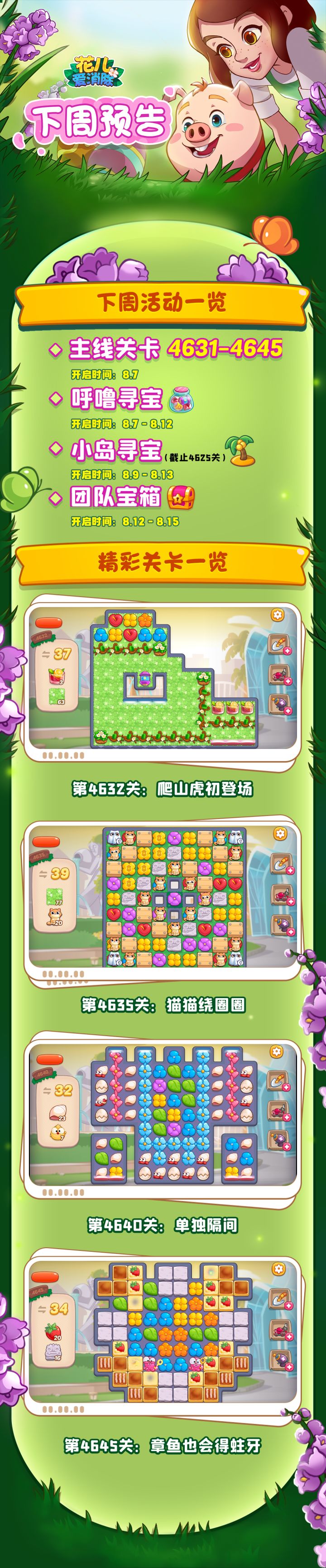 在即将到来的关卡更新中,4632关将首次出现新元素“爬山虎”。店主们需要点击爬山虎旁边的花朵来消除它的藤蔓。当所有的藤蔓都被消除之时,爬山虎才会消失。