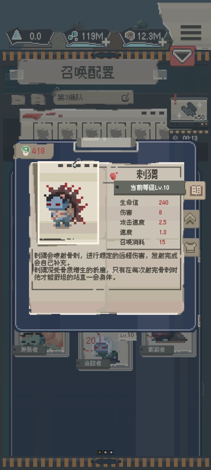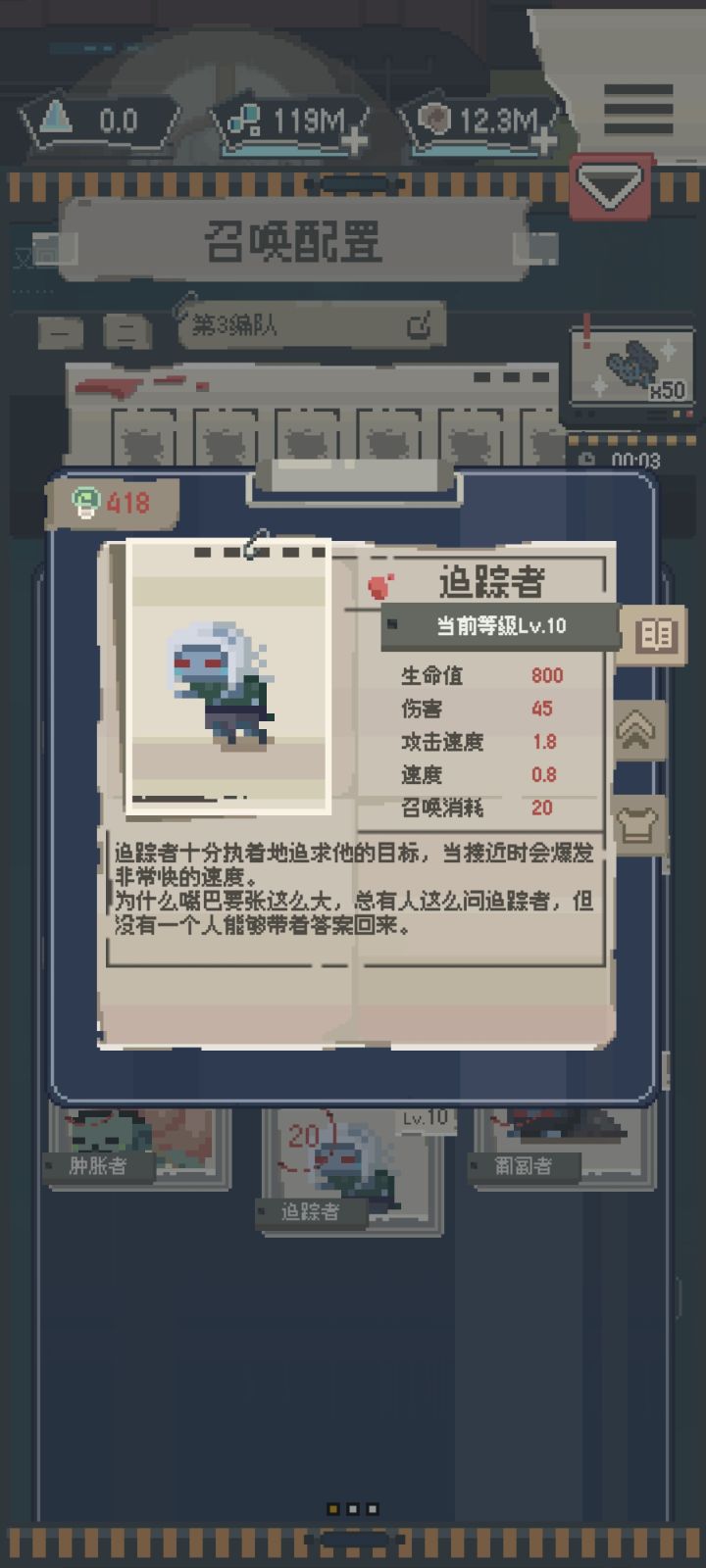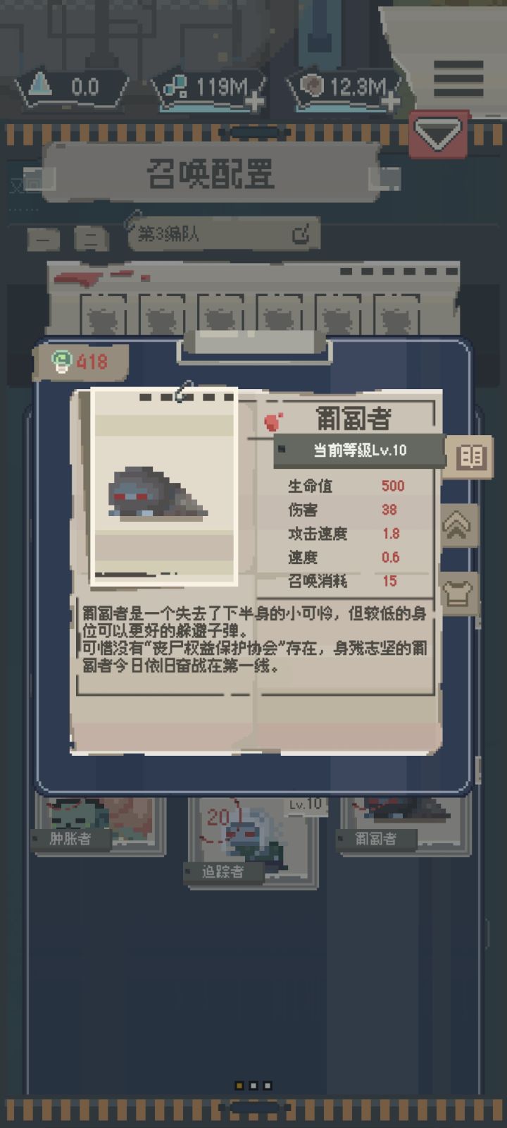 看到论坛的玩家都挺少所以做个丧尸测评玩玩以下内容仅供娱乐和参考NO.1 行尸强度:S+行尸速度快,费用低,伤害不俗,是前期推图的好帮手(虽然一天就可以通关没有什么前期后期…)根据本人测评无脑堆行尸就可以通关所有普通关卡了NO.2 追踪者强度:S+追踪者同样低费,但伤害更高,是人海流的不二选择,人多的地方它还会加速,用它!用它!就用它!NO.3 烟鬼强度:S+烟鬼有持续伤害的特性