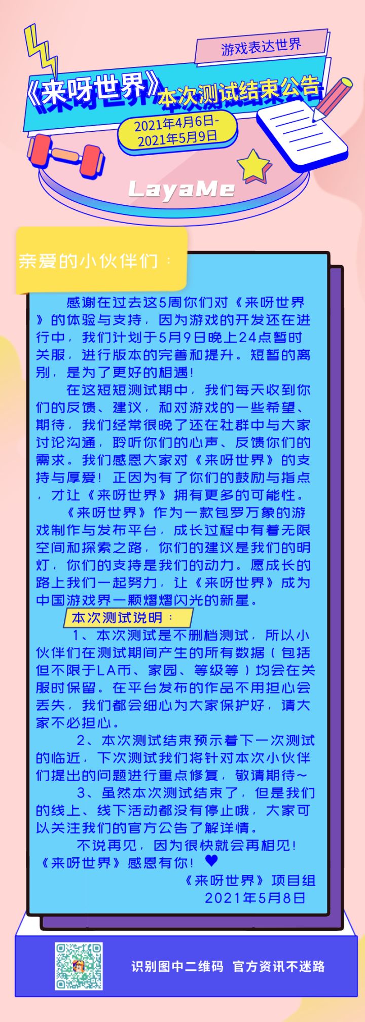 没错~亲爱的小伙伴们欢乐的测试时光总是很短暂《来呀世界》新版本将于7月4日24:00关闭下载没有下载的小伙伴们不要忘记去下载~★游戏下载平台:TapTap、好游快爆、4399★测试时间:6月25日10:00-7月25日00:00:00★测试平台:本次测试仅支持安卓手机★测试类型:不限量、限时下载、不删档、不计费测试这次新版本测试开放后各大平台收到大家很多反馈一起来感受