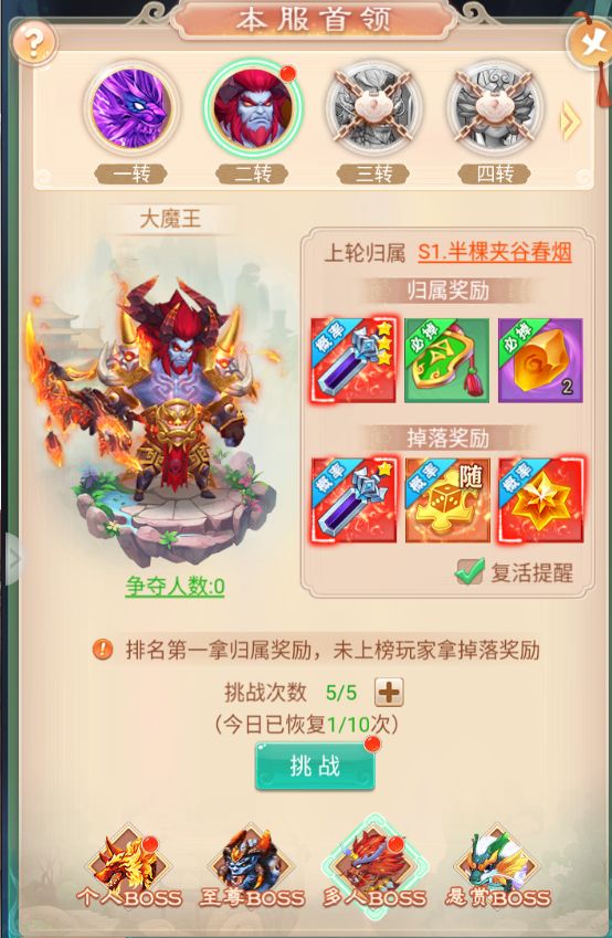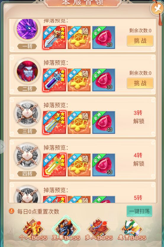 每个等级的首领每日只可挑战1次。