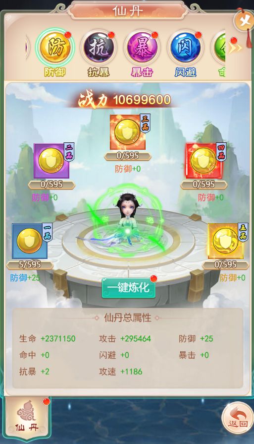 Ø 使用仙丹可以永久提升角色的属性。Ø 仙丹按照属性分为八种类型,增加不同属性。Ø 每种仙丹又分为5级,等级越高的仙丹,炼化后增加的属性越高。Ø 低级仙丹可以在合成界面中合成高级仙丹。
