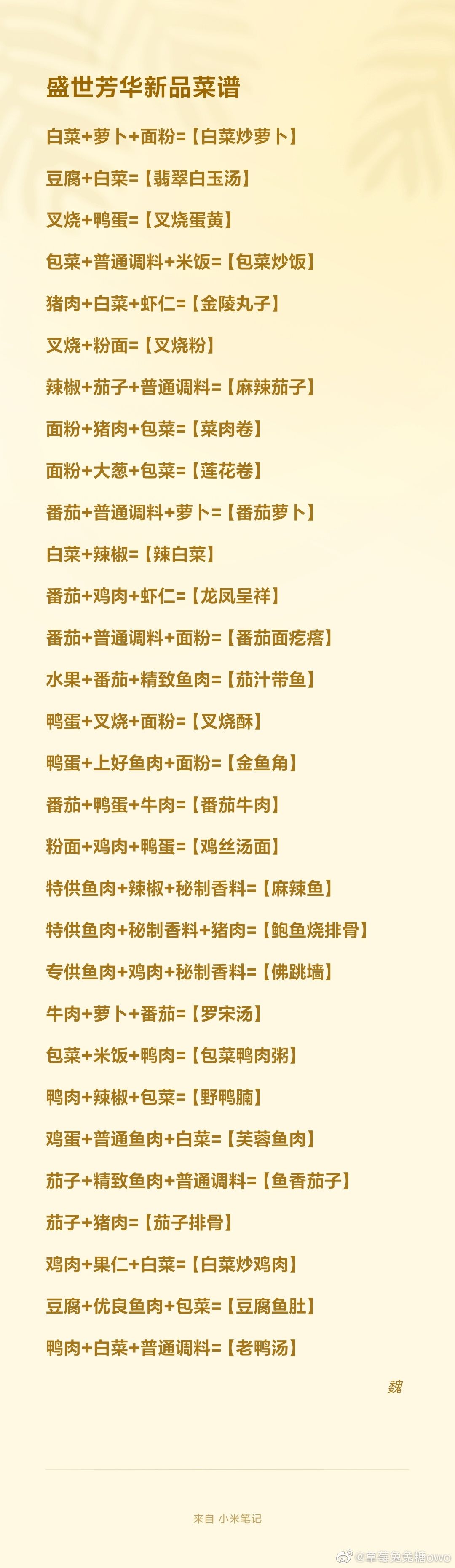 本帖主要搬运各个平台的菜谱, 不定时更新。7月开始更新 前两个菜谱由于制作周期比较早, 个别菜有所纰漏,比如清蒸武昌鱼。 【可以在评论区反馈】以防踩雷 11.25 转自微博,据说是11.4更新后新加的,一共30道,有精特尚御四类,顺序是乱的。大家可以自行挑选试做。(ps本人已退游,偶尔还是会上来更的,谢谢各位姐妹的支持,爱你们) 9.8 看菜谱可移步去第7楼,该菜谱几乎没有错误 旧的菜谱中所有的鱼