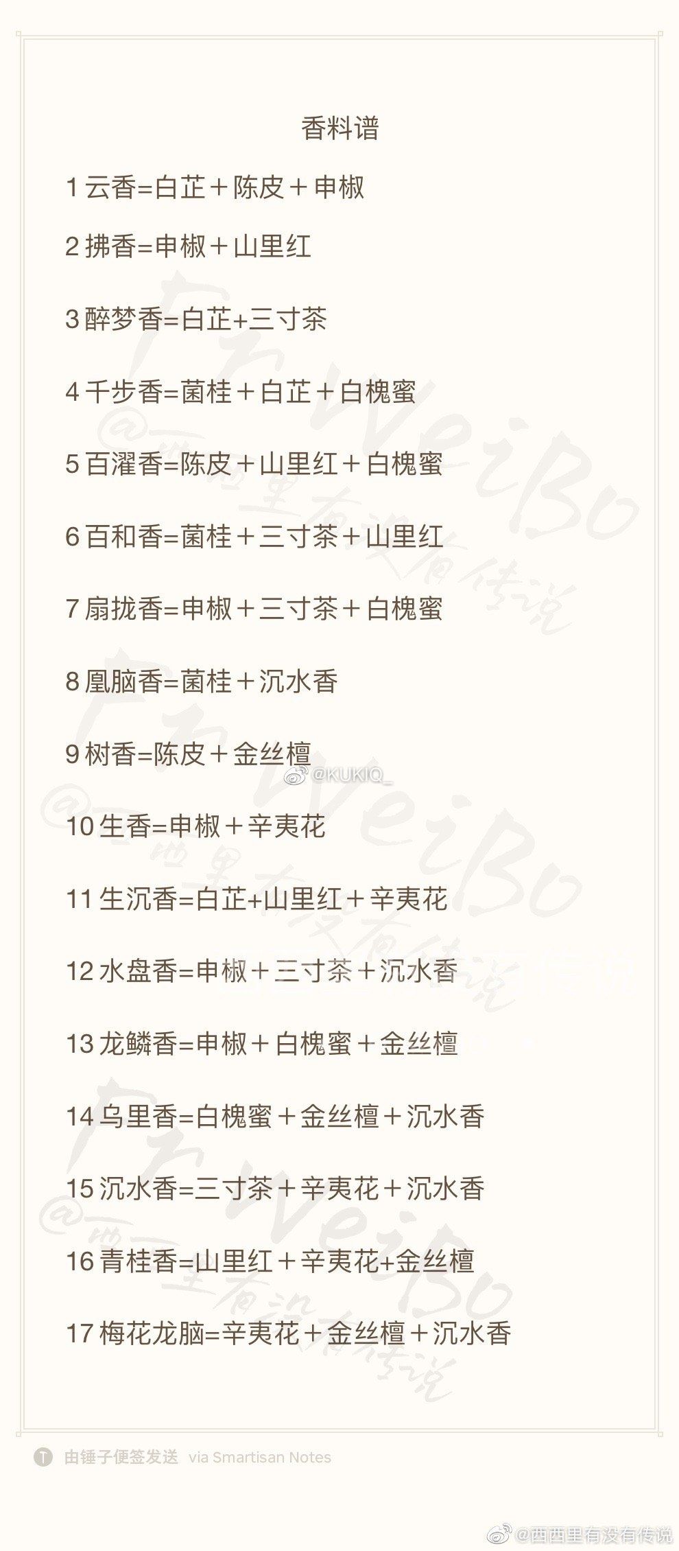 食谱-【增加的】 1云香=白芷+陈皮+申椒 2拂香=申椒+山里红 3醉梦香=白芷+三寸茶 4千步香=菌桂+白芷+白槐蜜 5百濯香=陈皮+山里红+白槐蜜 6百和香=菌桂+三寸茶+山里红 7扇拢香=申椒+三寸茶+白槐蜜 8凰脑香=菌桂+沉水香 9树香=陈皮+金丝檀 10生香=申椒+辛夷花 11生沉香=白芷+山里红+辛夷花 12水盘香=申椒+三寸茶+沉水香 13龙鳞香=申椒+白槐蜜+金丝檀 14乌里香=白槐蜜+金丝檀+沉水香 15沉水香=三寸茶+辛夷花+沉水香 16青桂香=山里红+辛夷花+金丝槽 17梅花龙脑=辛夷花+金丝檀+沉水香