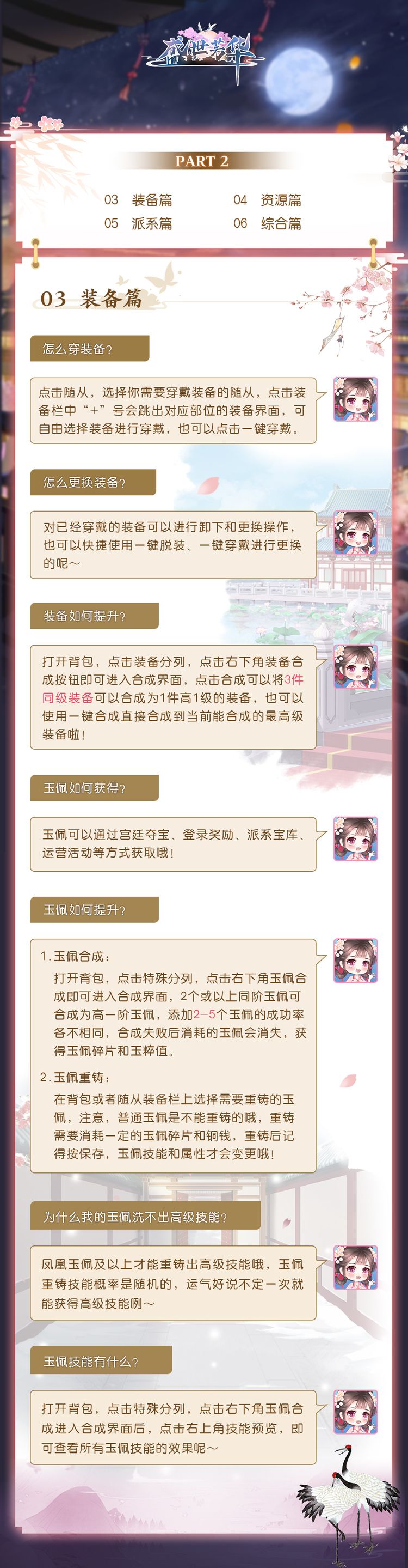 雁儿探头~ ▌其一给主儿们介绍了关于主角与随从相关的基础小知识~本篇重点介绍一下装备以及游戏内铜钱、阅历等资源获取的相关小知识~ 新进宫中的主儿们,快来和雁儿一起看看吧!已经得心应手的主儿们也来和雁儿复习小知识~宫中生存,需要满满的细节方可青云直上哦~ 以上是雁儿和策划大大整理的第二份《盛世芳华》生活手册,希望能给主儿解答疑惑,如果各位主儿有任何意见和看法欢迎在下方评论区发表呀~~ -------