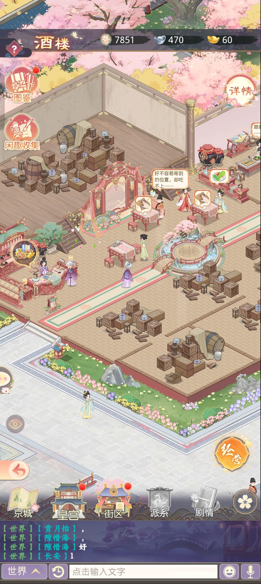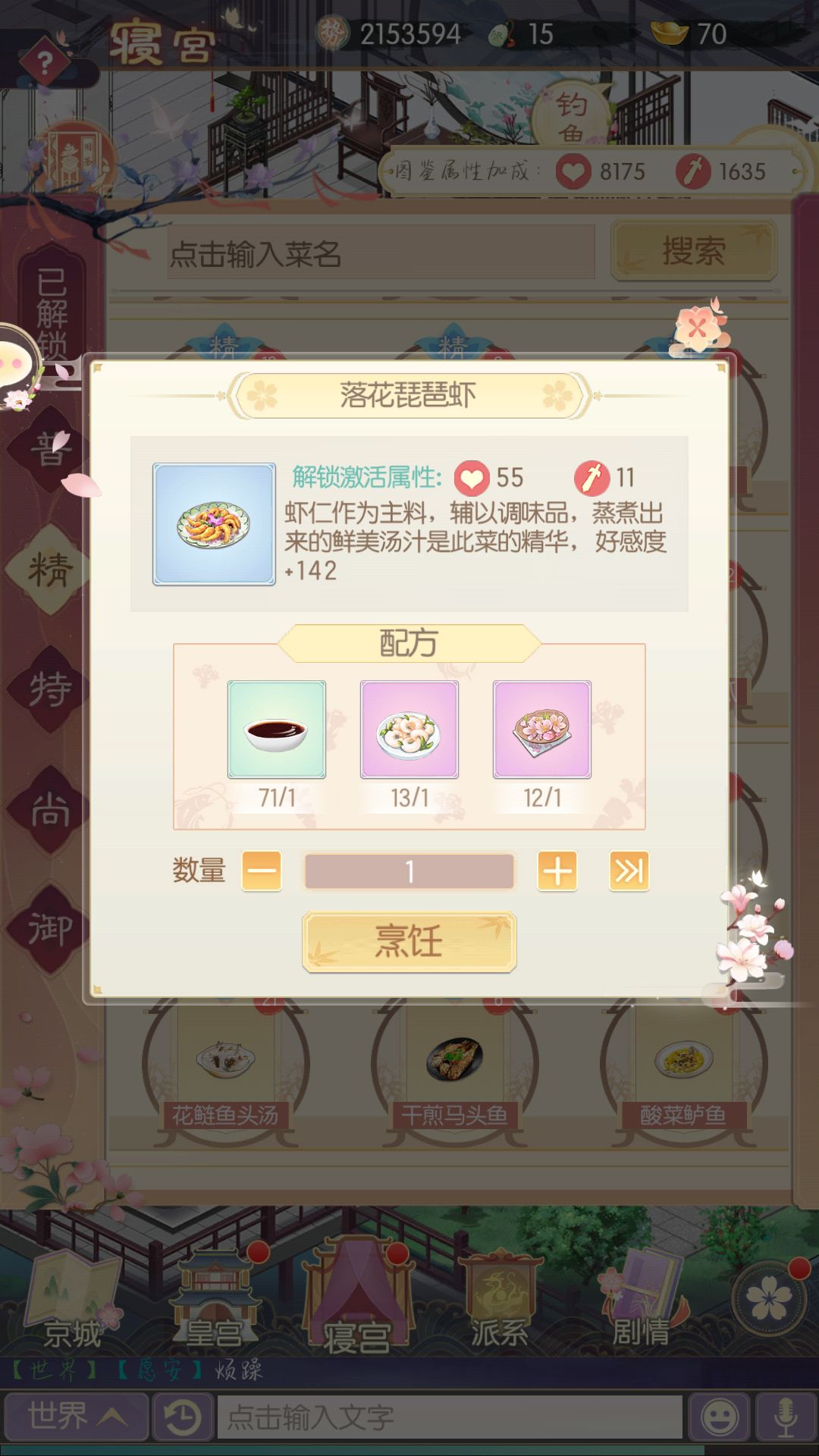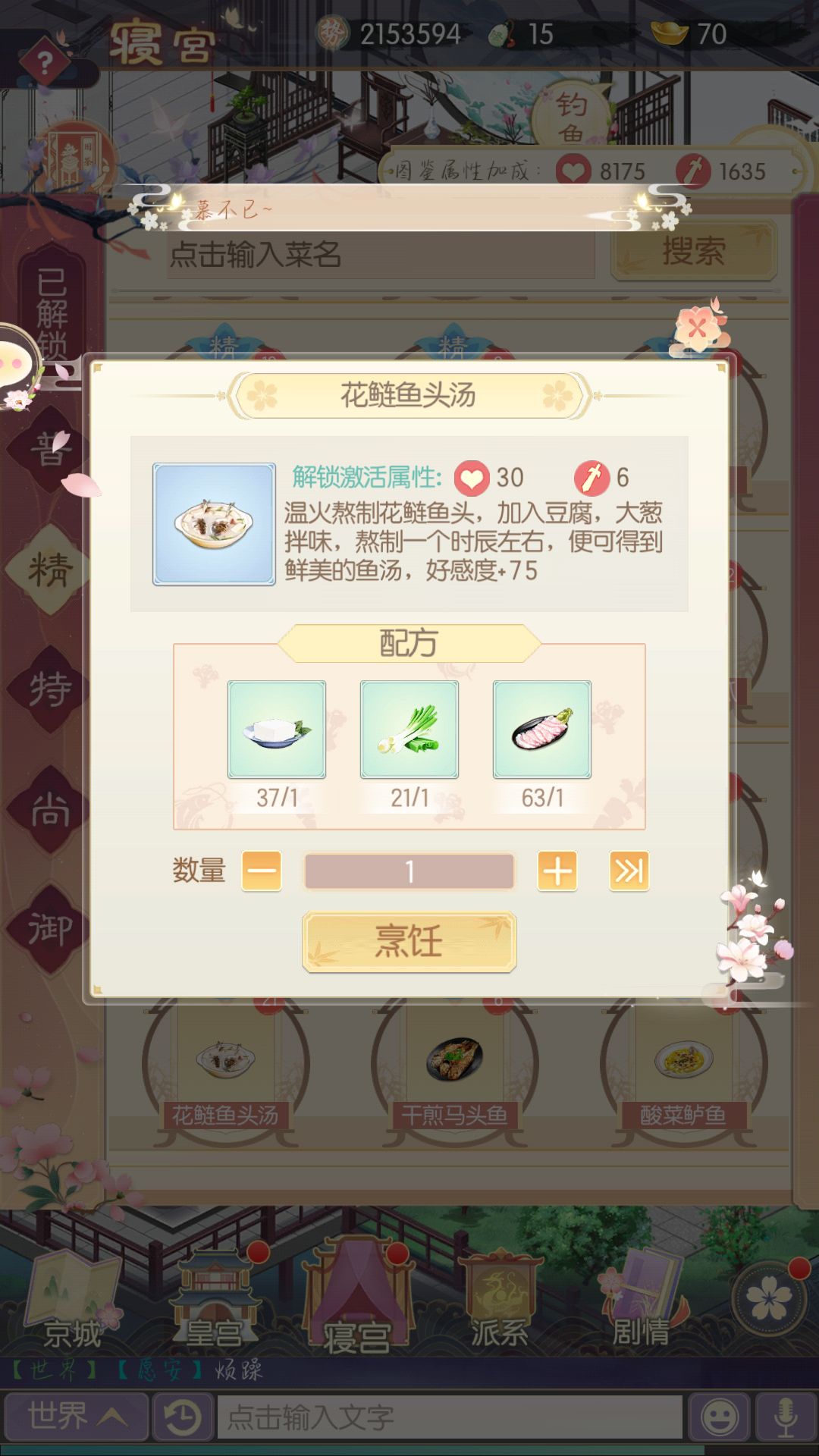 新手攻略:一些需要注意的小地方(完全是自己打游戏没注意到的) 1:需要的配料如果自己的集市没有的话,可以去别人家购买,赠送菜肴给皇帝,提升皇帝的好感比较重要,可以获得祈愿笺和锦绣稠兑换衣服 2:不要忘记情缘右边有个请安,可以获得元宝 3:还有就是前期不要只注意给随从升级,还要升星,玉佩和装备也要合成,如果缺少玉佩可以在商城派系购买 4:还有就是注意下图寝宫的目标,修缮也比较重要 5:随从的话我觉得