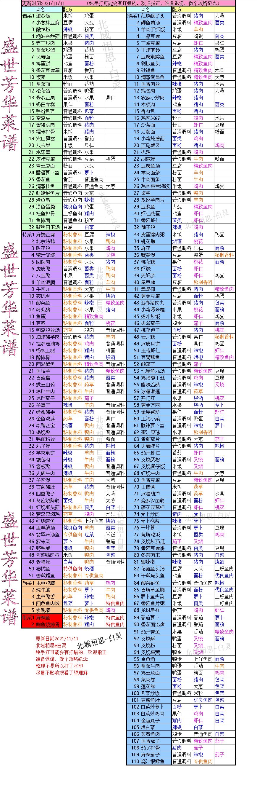 2022/03/09更新之前12月的菜谱 一直有点赞关注的,所以谢谢支持~ 今日无事更新一波,有不对的随时叫我改改 要源文档的可以私聊,谢谢大家~ 祝大家天天开心😘😘😘 ———————更新分割线———————— 盛世芳华菜谱整理~更新至11月11日 玩了快一个月了快玩不动了 做个攻略纪念一下😘😘😘 刚对着游戏里的菜谱一个个打的应该没啥问题 有问题的话欢迎指出来我去更新下😂😂😂 我是白灵,一个集美貌与才华于一身的好人😎 ps修正一下: 精菜69鱼香豆腐=豆腐+大葱+精致鱼肉🐟