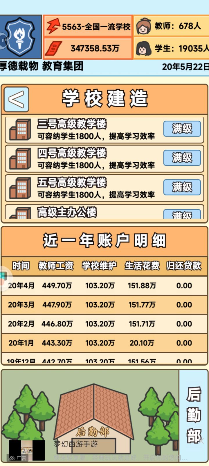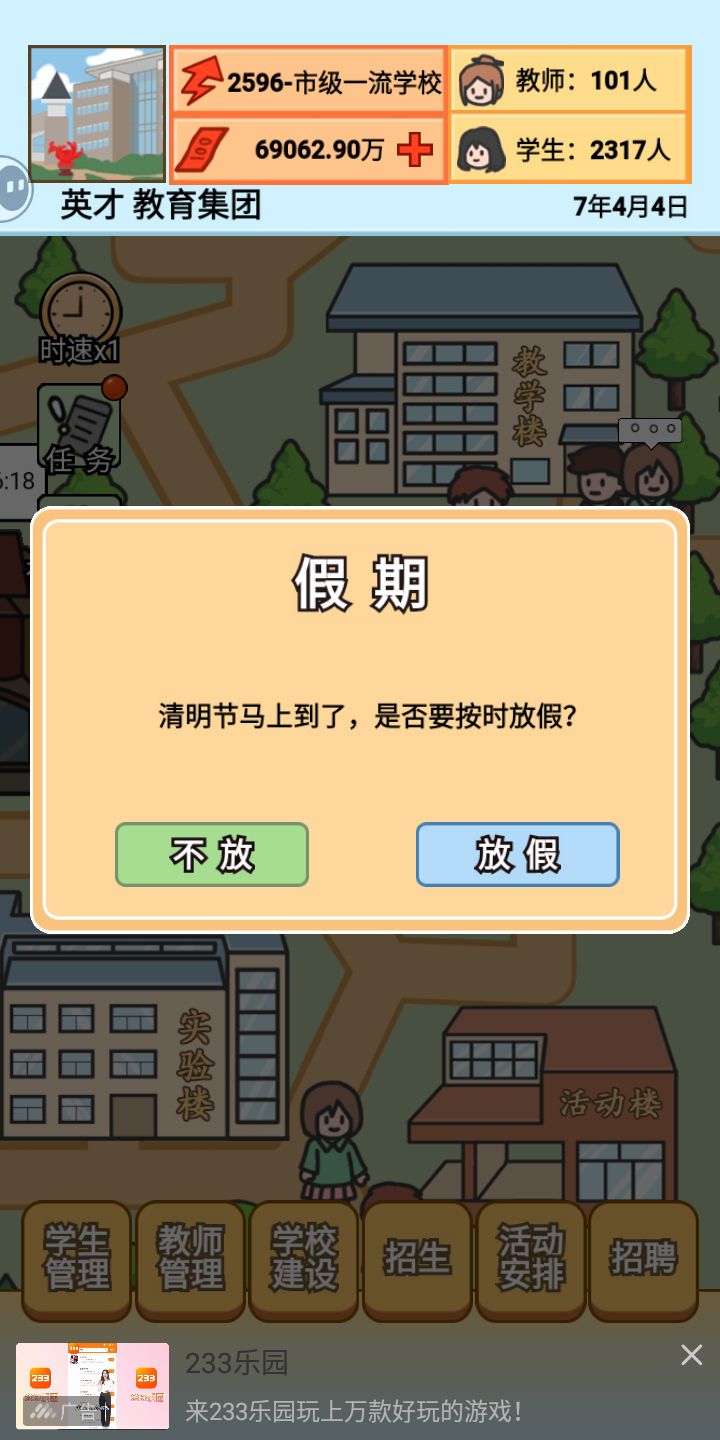 1.建筑满级之后就不能再升级了,搞得我学明明可以收更多学生但是不可以😐,建议新增建筑2.明白恰饭的苦但是能不能别强制广告,虽然就5秒但是真的很恶心人3.初中小学没有老师还能正常运行4.bug,本次结算有4000名学生选择本校就读,实际为0人(图上传不了哇)
