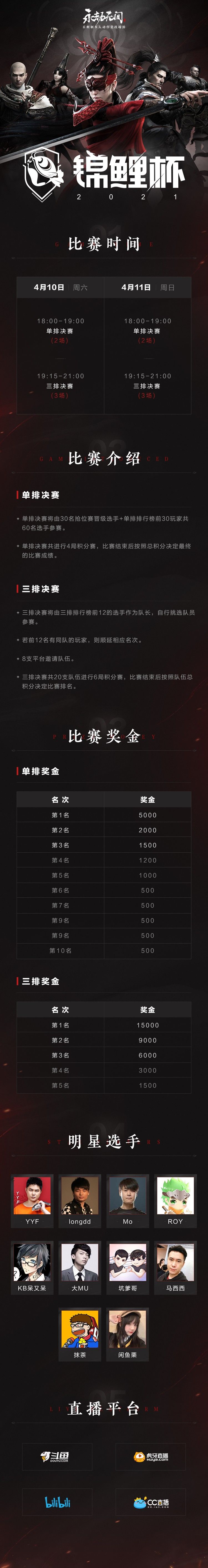 周末两天,下午6点开始,锦鲤杯决赛刺激展开!超多实力派明星选手参赛。看直播还有激活码送嗷!不容错过 锁定官方直播间—— 斗鱼: 虎牙: Bilibili: CC: