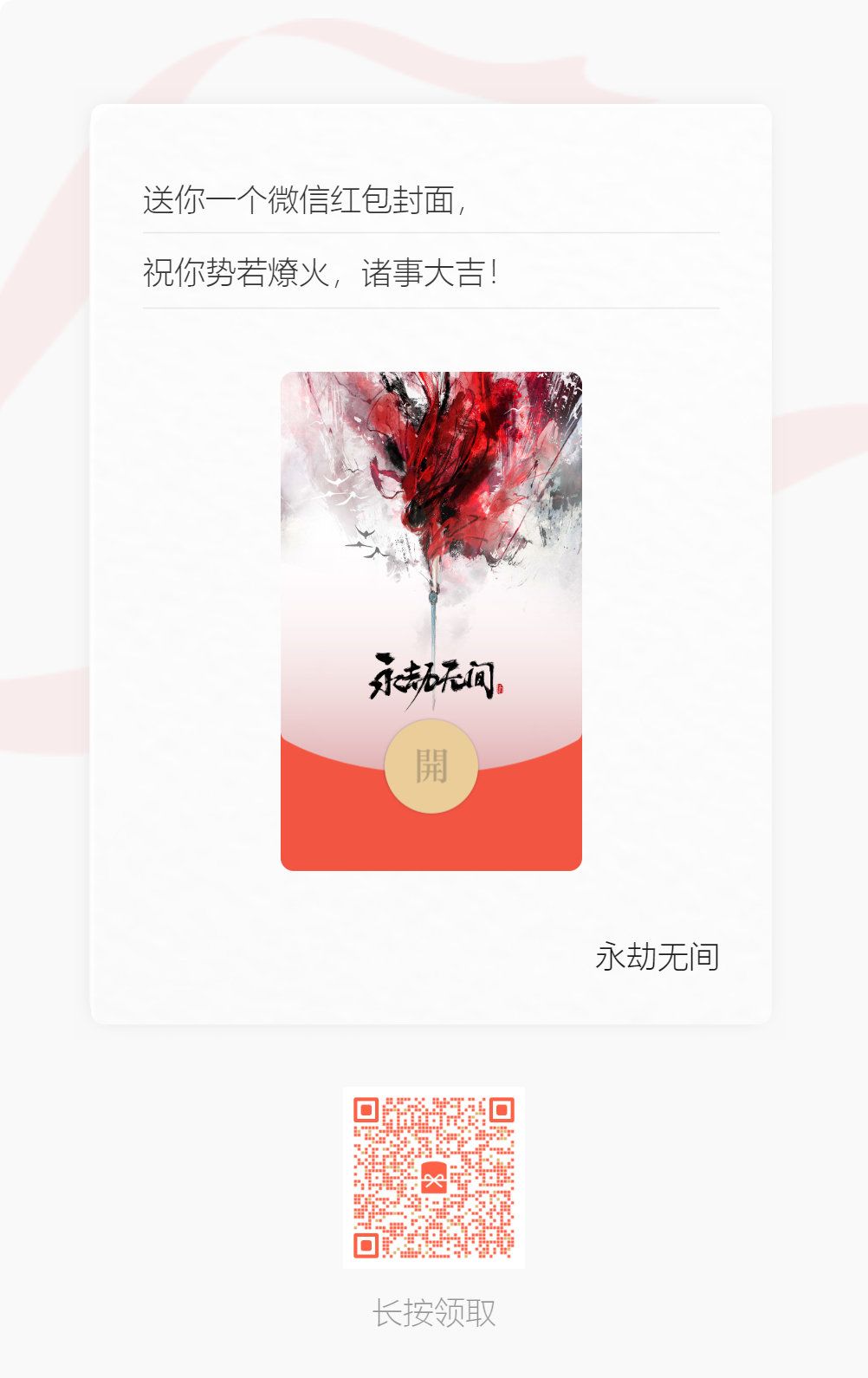 2021年12月12日,永劫无间【咏武斗剑大会】发布会圆满落幕。五大联动,多项爆料,让玩家们大呼过瘾。即日起,至2022年1月12日,扫码即可生成专属于你的永劫无间年终数据总结“聚窟洲奇人志”,分享更有机会赢取限定长枪皮肤! 操作步骤: 1、扫描二维码,进入活动页面。 2、绑定游戏账号,即可获取你的专属“聚窟洲奇人志”。 3、长按保存图片并分享,即可获取咏武斗剑主题宝箱(12月22日结束领奖),打