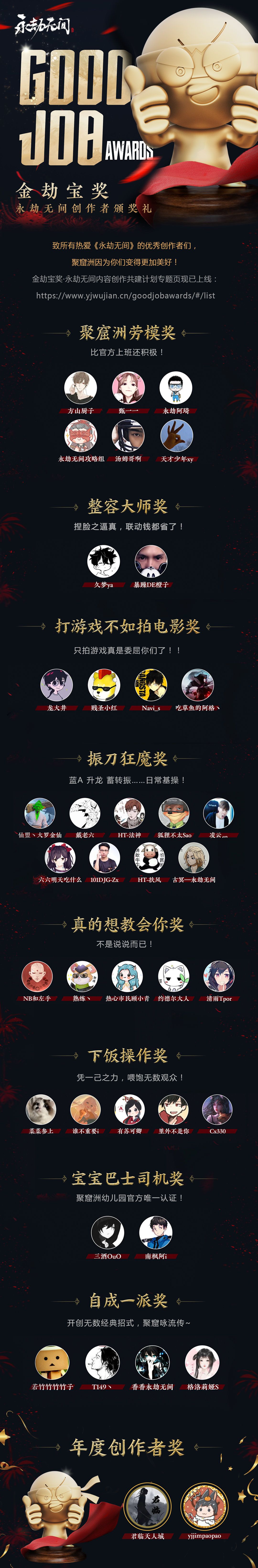 玩笑中掺杂着认真?人手一个的“金劫宝奖”可以看出大家都是“整活达人”! 非常感谢半年来各位创作者们的支持,永劫无间金劫宝共建计划启动! “金劫宝认证”向所有创作者开放自由申请 优秀创作者有机会获得官方扶持:流量扶持、创作基金扶持等奖励 享受官方高清素材资源,并随游戏进程陆续更新 本次奖项名称纯属娱乐,各位看官乐呵一下就好~了解金劫宝奖得主及活动详情请戳下方长图!