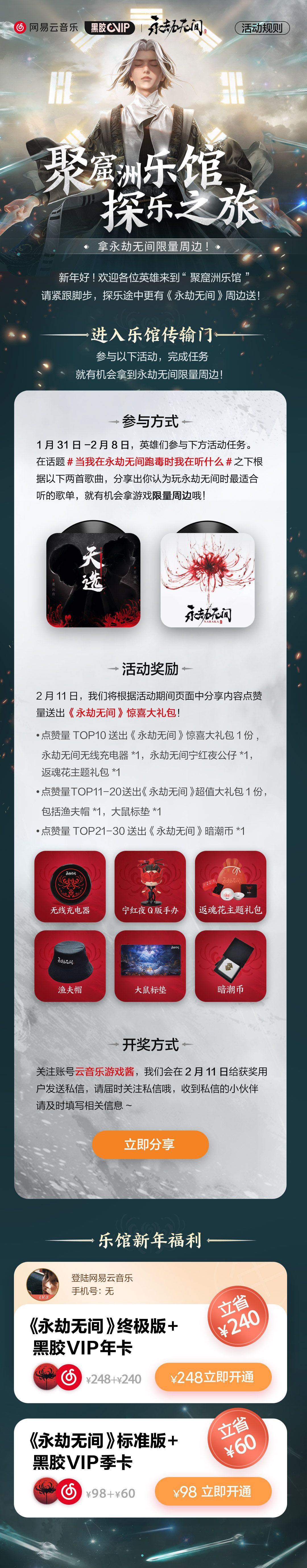 新年新气象,聚窟洲乐馆探乐之旅即将启程! 请紧跟步伐,探乐途中更有永劫无间周边相送~1月31日-2月8日,英雄们在话题#当我在永劫无间跑毒时我在听什么# 内参与活动,就有机会获得限量游戏周边!