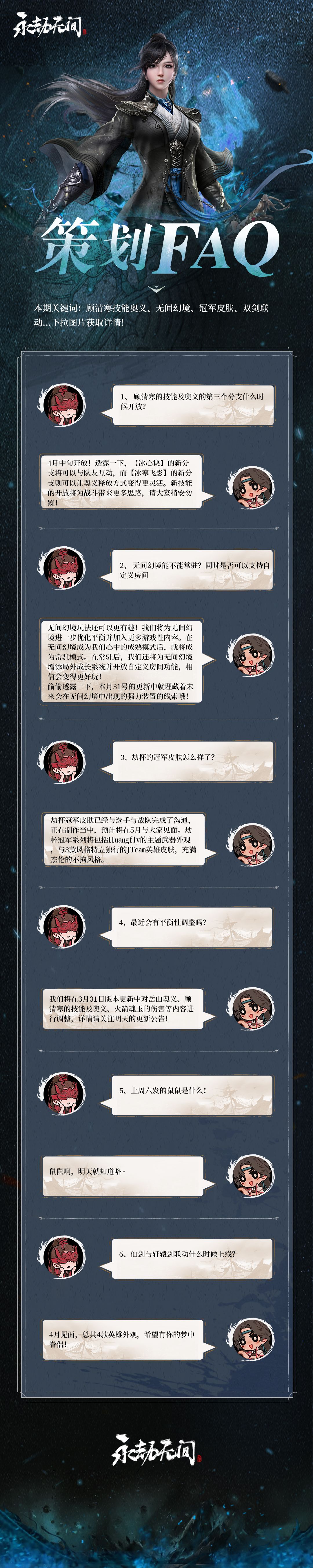 本期关键词:顾清寒技能奥义、无间幻境、冠军皮肤、双剑联动 久违的策划FAQ回归啦,来看看最近各位关注的问题策划都是如何解答的吧!