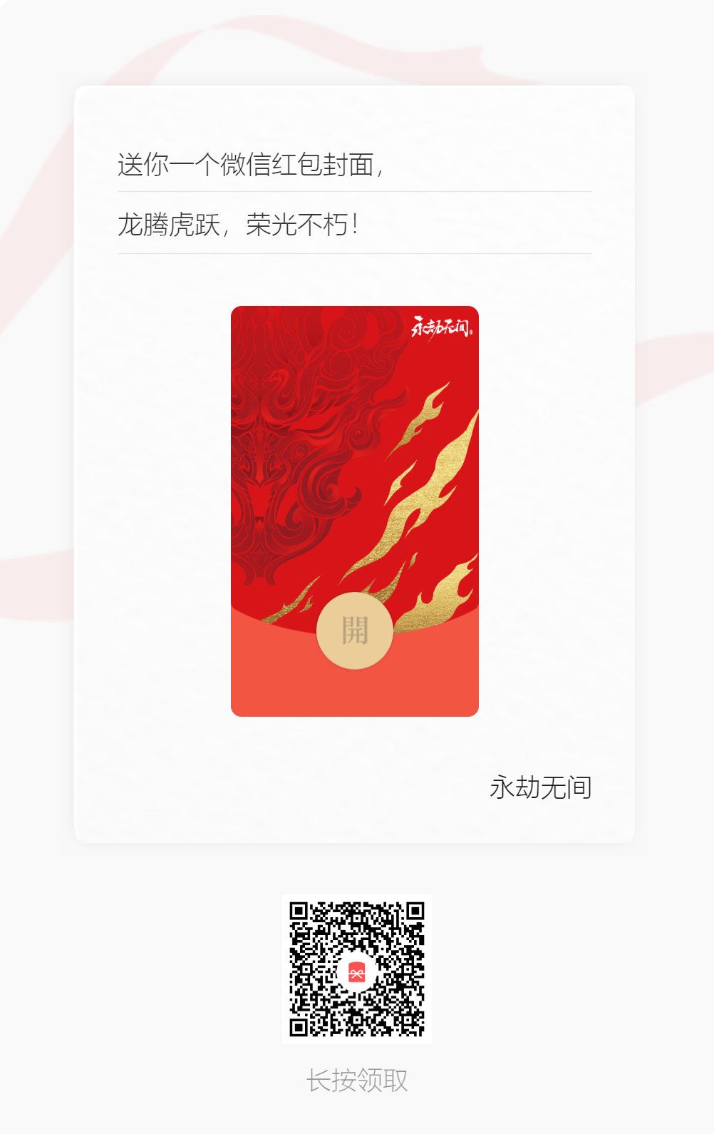 龙腾虎跃,荣光不朽。 今天是北方小年,愿人间逢小年,所求皆如愿!不朽面具前来送福啦~ ▼快快使用微信扫描下方二维码,领取专属红包封面吧▼