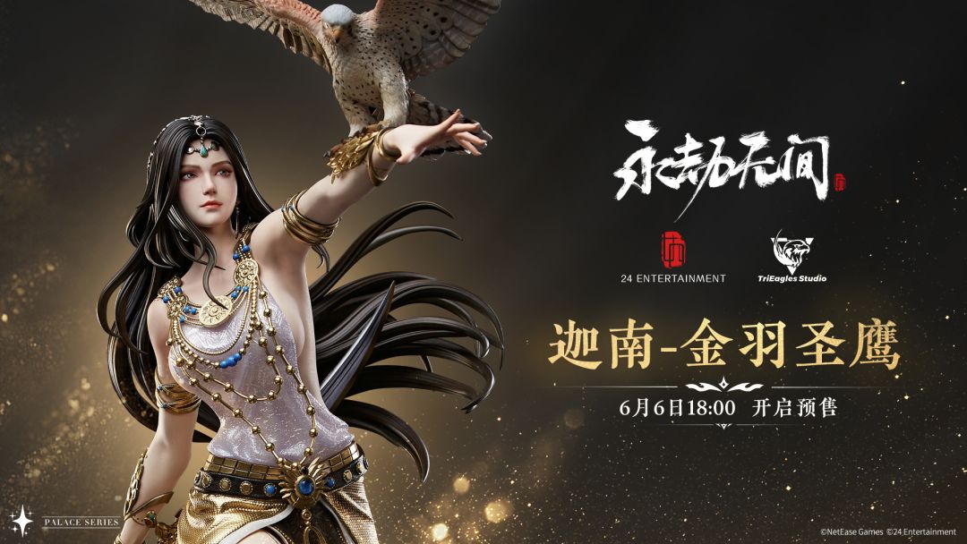 永劫无间首款官方雕像来咯! 24工作室授权业内一流团队@TriEagles ,倾力打造了绝美的【迦南-金羽圣鹰】雕像,1/4的大比例,让你饱览迦南的妩媚与矫健。 雕像售价及购买信息详见https://item.taobao.com/item.htm?spm=a1z10.3-c-s.w4002-21862010743.9.c8747f8eZuKGJv&id=676123398303。 周年庆将至,更