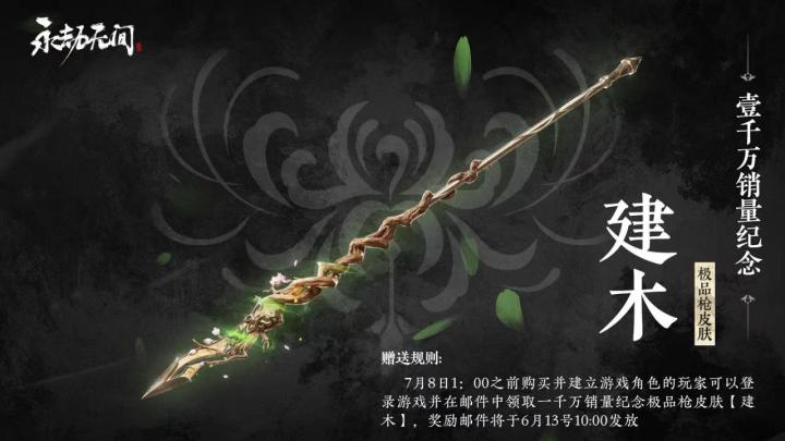 一千万销量纪念武器已通过邮箱发放到各位玩家账号中,请查收。感谢各位玩家的支持与陪伴!#永劫无间全球销量超1000万份#下附邮件全文:亲爱的玩家:永劫无间1000万销量达成!感谢玩家们的关注与支持,为了纪念这一里程碑时刻,我们将为在7月8日前建立的账号送上极品枪外观【建木】。只要精心雕琢、满怀热忱,古木亦可开花。我们的心情与这把从流星中继承的长枪一样。只要有大家的支持,24工作室哪怕动作游戏开