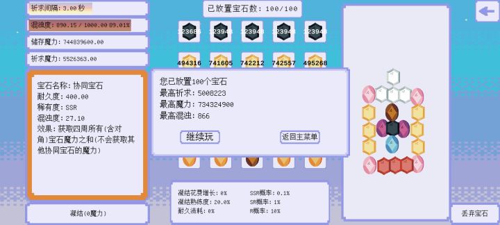 初看游戏很复杂,不同的摆放位置,混浊度,魔力值,看似庞大的系统,其实很多都不用管。这里面最重要的一个属性是凝结花费增长,只要让它=0,就等于有无数个宝石以几百的价格免费送(我第一次尝试到0的时候价格是782),也就是说前期努力刷出累计可以-12%凝结花费增长的节省宝石就能保证百分之一百通关,而且基本上可以在1000费用前凑齐,后面随便凑凑什么幸运宝石,耐久宝石,邪恶宝石,协同宝石巴拉巴拉的,可以说