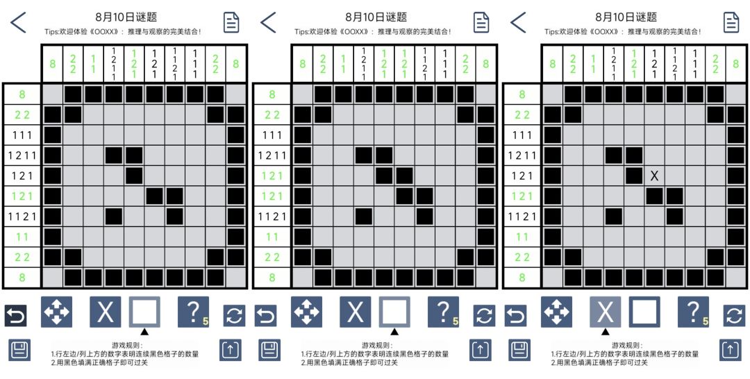 感觉最近特顺,想玩啥就能遇到啥哈哈哈 这个游戏跟数独类似,都是填空+排除,真的挺有意思的,常用的几种解法:(后附随便找到一关的通关流程) 名词解释: 已知数:该列或行所给出的那些数字 空格数:已知数中间的空格(比如4 4是1,1 1 1 2是3) 总数:一行总共的位数(如10*10的表格为10) 1.满填充。如果已知数++空格数=总数,那么就可以直接填进去了。 2.波动。如果某行或列只有一个数,当