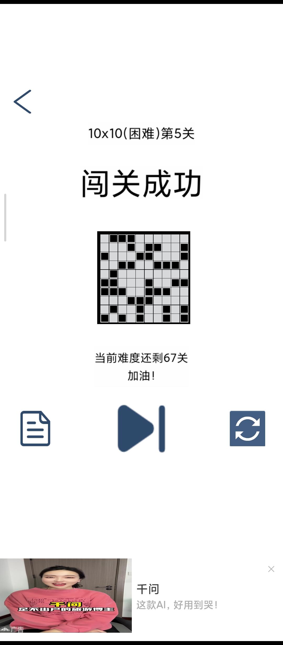 断断续续玩了快两个月,总算是通关了。我基本遵循以下几个步骤:1.开头先根据一些比较大的数确定基本盘面,比如在10X10的方格里出现6,就可以先把中间两块涂黑,因为这两块“一定有”。 (最左与最右的重叠部分为一定有)(Tips:如果前面距离边框比较近的话,可以“往回顶”。比如横向要求5,而我们先前确定了当行第三列有一块,那么从那一行的边框往右数五个,确定的那一块右边的就也是一定有的)(首先
