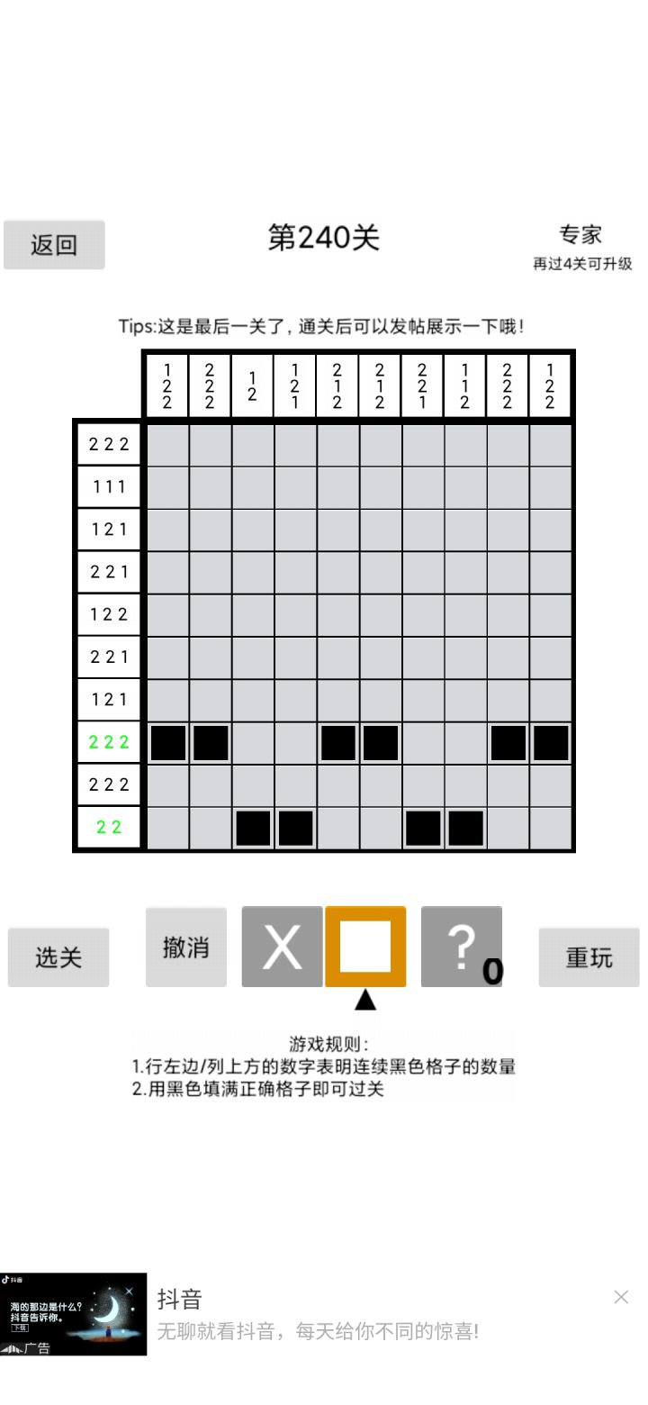 图多杀猫(不是)(ಡωಡ)有些技巧我就不详细讲了,能玩到240关的肯定都是有自己的游戏理解_(•̀ω•́ 」∠)_图太多,有些影响观感,但实在是懒得把每一张图再截一遍。_(:з」∠)_如果发现那里有问题可以评论区问我 |・ω・`)正片开始(ง •̀_•́)ง首先,我们以左上角为原点,从上到下写成一到十行,从左往右写成一到十列,方便标记个点位位置。这关的关键,就在于第八行和第十行,也就是