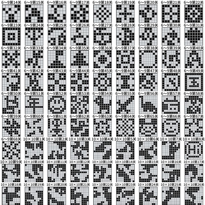 断断续续玩了快两个月,总算是通关了。我基本遵循以下几个步骤:1.开头先根据一些比较大的数确定基本盘面,比如在10X10的方格里出现6,就可以先把中间两块涂黑,因为这两块“一定有”。 (最左与最右的重叠部分为一定有)(Tips:如果前面距离边框比较近的话,可以“往回顶”。比如横向要求5,而我们先前确定了当行第三列有一块,那么从那一行的边框往右数五个,确定的那一块右边的就也是一定有的)(首先