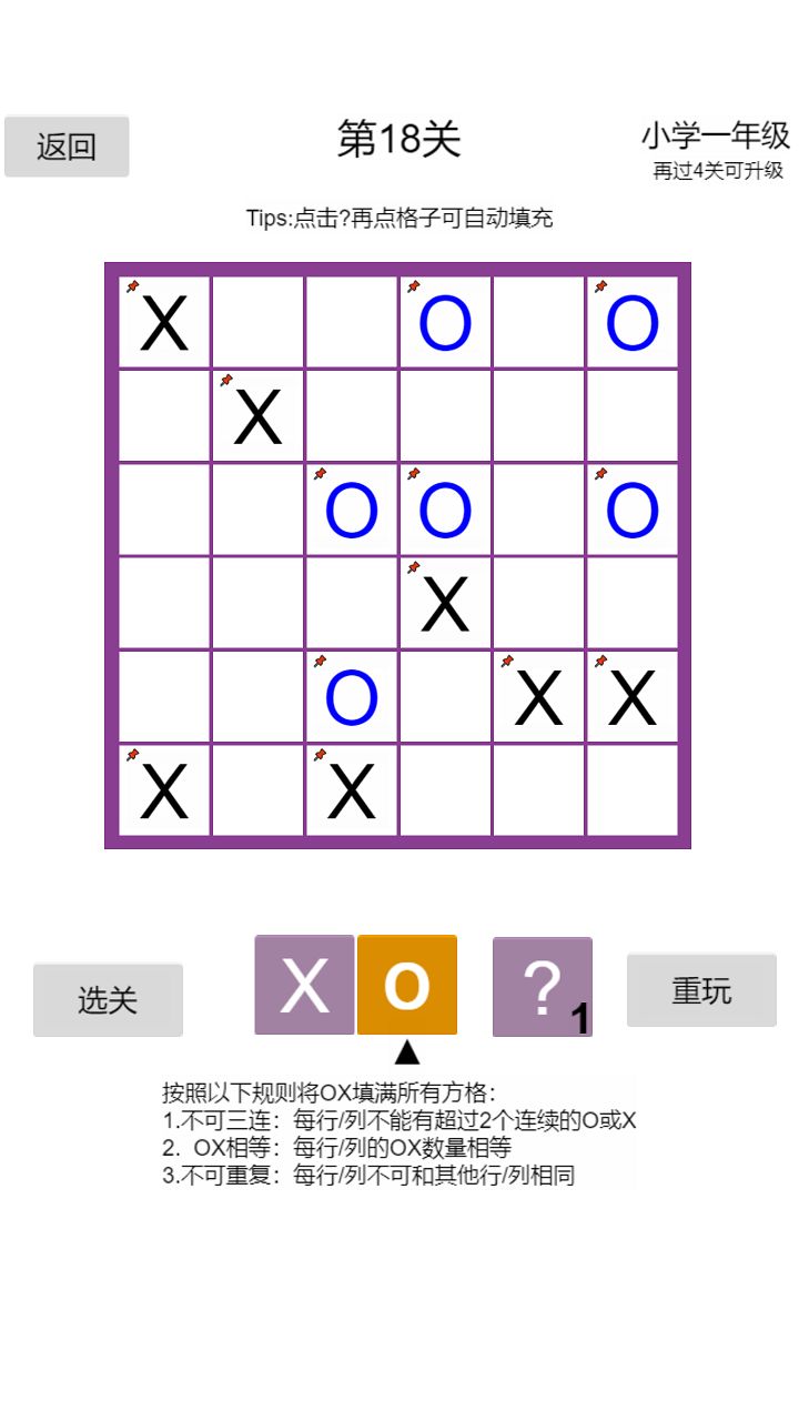 一个人玩的井字棋加强版OOXX已上线!益智烧脑!欢迎来玩!下载地址:https://www.taptap.com/app/207338OOXX和我们小时候玩的井字棋很像,也被称为二进制数独或二进制拼图。游戏规则简单易懂,将OX按要求填满所有方格即可: 1.不可三连:每行/列不能有超过2个连续的O或X2.OX相等:每行/列的OX数量相等3.不可重复:每行/列不可和其他行/列相同
