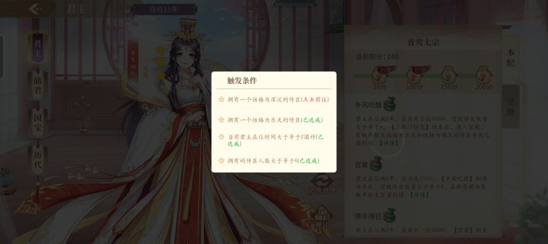 这里只是举个例子,我派遣的宫人,技能都是减龄邪术的(一天可以触发3次,侍臣一次减5岁,宫人会降低健康值) 首先,必须得初始性格为活泼的娃(健康值最好是720的)才能培养宫人 然后,记住自己想要的技能对应的(道德/勇气/智慧/幸运)选项,技能结果是看最高分数的 最后,选定宫殿派遣 如果不想要这个宫人了,可以在宗人府找到宫人(筛选),用暗者把宫人抓起来,流放(不流放的话,宫人还是占着宫殿的位置的) 重