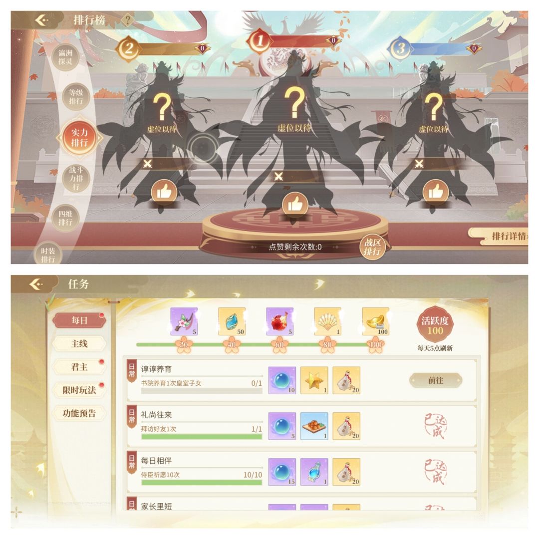 [表情_加油]图1.每日任务(图下)&排行榜(图上):①每天完成任务活跃度达到可以获得100绑金+1云裳币等②点赞前三名可获得10绑金(每天次数五次) [表情_加油]图2.征战:①巡防(图上)有时爆绑金,②挂机奖励(图中)银币与经验的主要来源,有的时候会一个始祖碎片③挑战可以手动,反正也不会打不过[表情_吐舌头](bushi [表情_加油]图3.培养天赋:①倔强:个人认为毒舌有用,在提血中必不可少