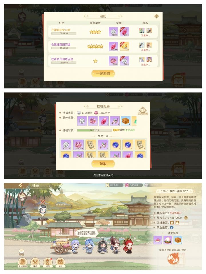 图1.每日任务(图下)&排行榜(图上):①每天完成任务活跃度达到可以获得100绑金+1云裳币等②点赞前三名可获得10绑金(每天次数五次)图2.征战:①巡防(图上)有时爆绑金,②挂机奖励(图中)银币与经验的主要来源,有的时候会一个始祖碎片③挑战可以手动,反正也不会打不过(bushi图3.培养天赋:①倔强:个人认为毒舌有用,在提血中必不可少