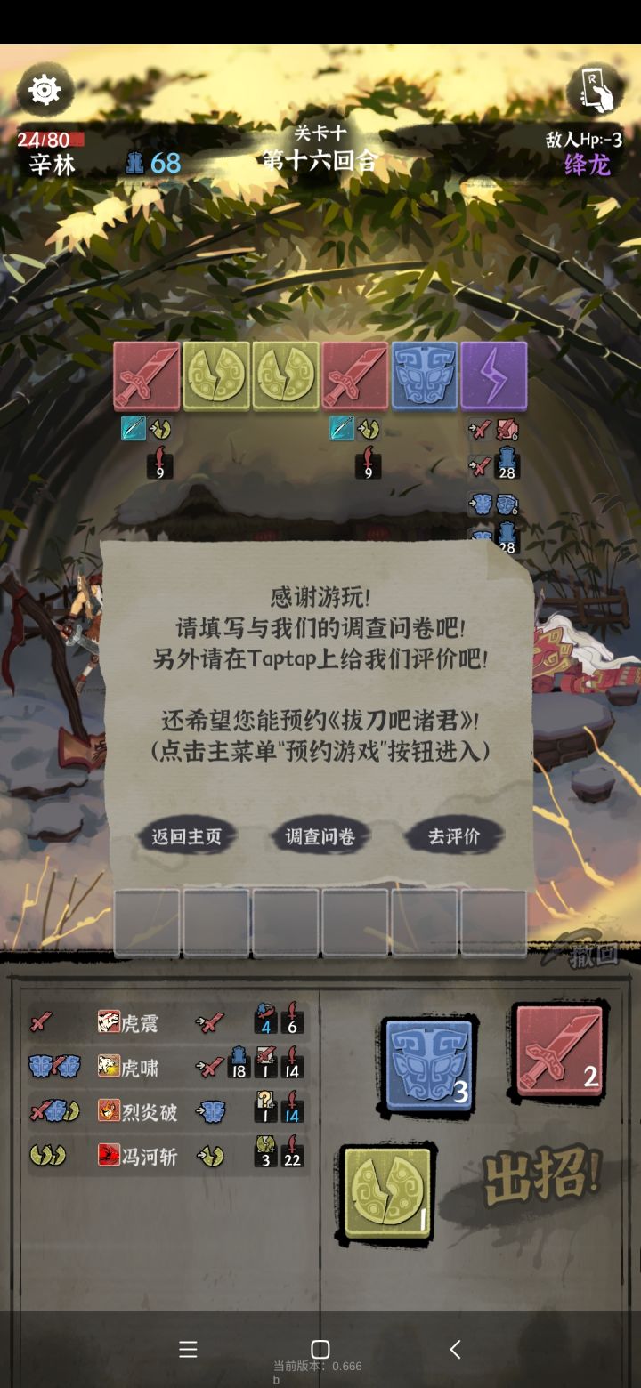 游戏题材新颖(或许是我玩的比较少... ),动画做的也很不错。上班摸鱼期间玩的,没开声音不知道音效如何。建议1.完善一下帮助系统,毕竟没怎么注意引导内容,开始还以为是类似“石头剪刀布”的通用相克关系,后来才知道必须根据招式内容才行成克制或者造成伤害。2.战斗双方头像下的状态栏建议设置为点击可看详细内容。3.再多点骰子或降低一些前期招式门槛,经测评后发现基础招式最容易通关,反倒那些花里胡哨的