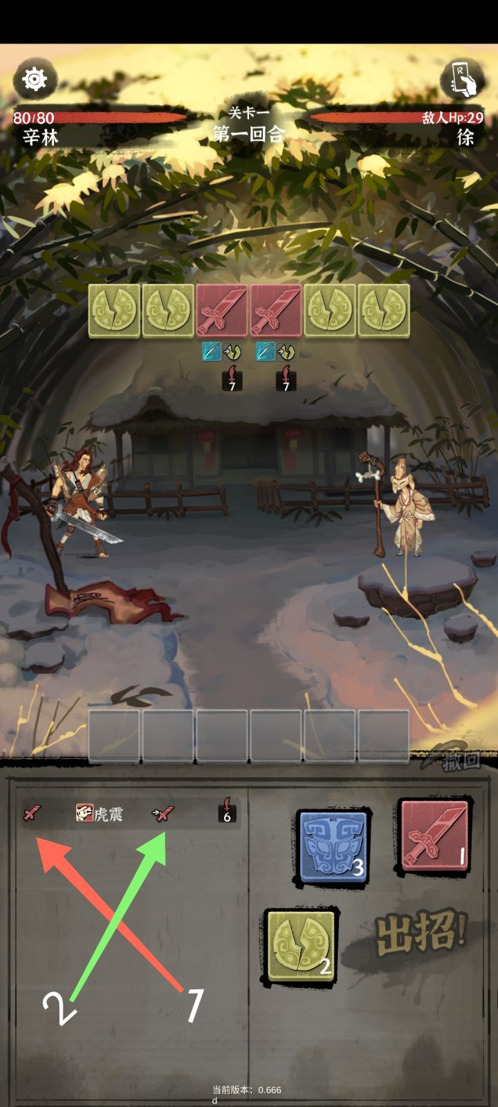 麟角凤毛虎震:攻→攻,6伤害虎臂:守→攻,5伤害伏虎:攻守→守,+6盾冯河斩:破破→破,14伤害断桥:守攻→破,8伤害,+3盾斩铁剑:攻攻攻→攻,15伤害沥血刀:守破破→守,5伤害持续3回合烈炎破:攻守破→守,14真伤,下回合随机招式+1虎啸:守攻守→攻,10伤害,下回合攻招+1残阳断虹斩:破破守攻→破,32真实伤害万刀枯直击:攻→破,7伤害弹刀:守→攻,僵直3层造成9伤