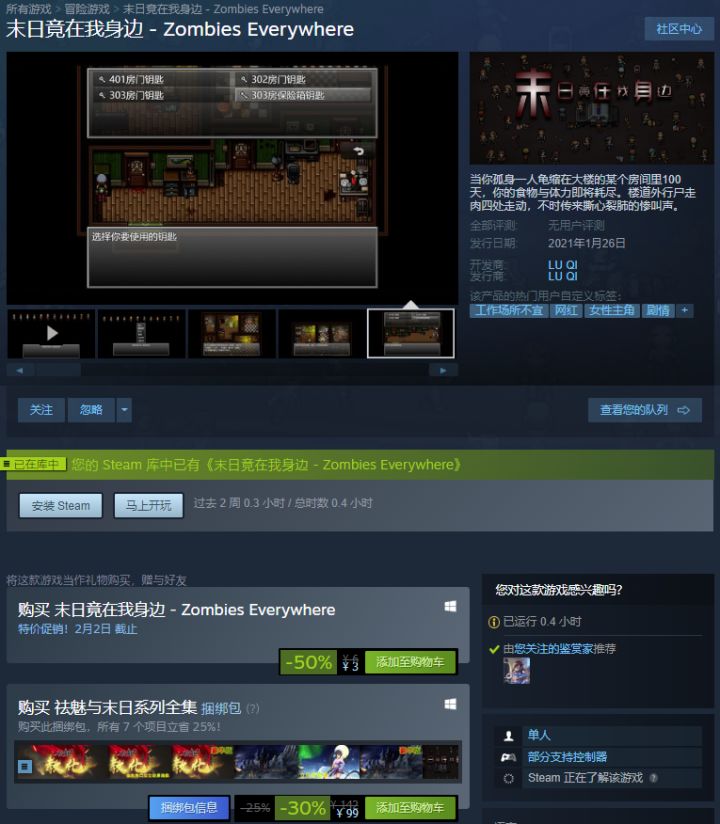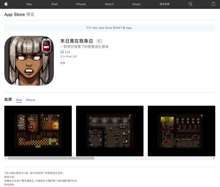 独立游戏制作人陆琦开发的新游《末日竟在我身边》IOS版已于2021年3月1日登录苹果商店AppStore,免费下载!苹果AppStore下载欢迎购买电脑Steam版和充电打赏,为制作人回血开发新游戏!电脑Steam下载
