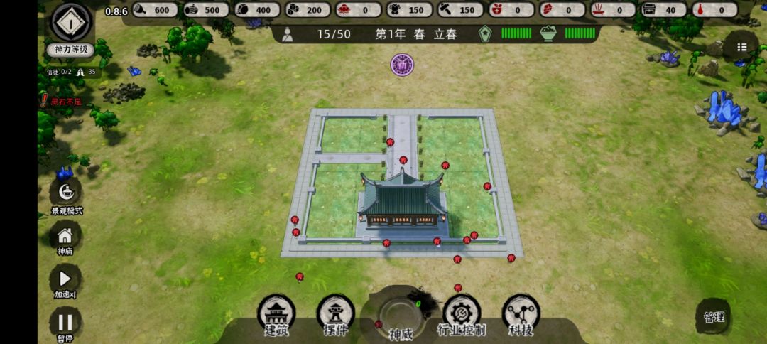 开局后神权那里有四个神像,可以用来解锁神,神解锁后就可以获得神庙,神庙自带虔诚点数。 白帝:总结下来就是居民的衣食住工的卡牌加成。 青帝:总结下来就是农业与矿业卡牌加成与生成。 赤帝:总结下来就是居民的饱腹娱乐与生死的卡牌。 黄帝:总结下来就是移动速度成长速度人口增加与消灾。 蚩尤:总结下来就是坏蛋,但可以召唤妖兽,打败后获得物品。 我主推荐升,青帝与黄帝,但要小心别的神的神怒(应该可以用烧香解除