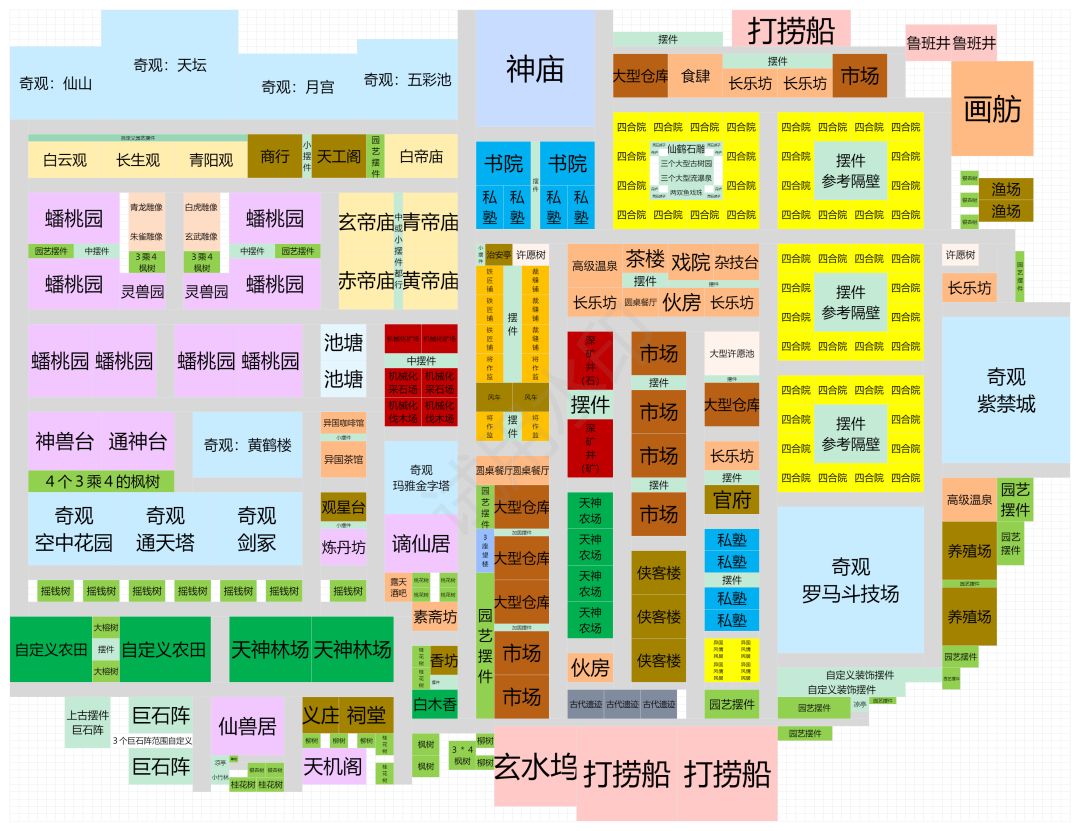 布局地图:蓬莱岛 金字塔和兵马俑,开局要勾选它两图纸,这样开局天工里就会有,商行里刷不出它两图纸。 摆件不固定,石铁木和房子数量不固定,高级温泉前身是温泉或澡堂,长乐坊前身是吃饭场所,养殖场摆设而造。 神兽台需要刷牌的可把枫树换成机关天工的摆件。 阳光黄昏,烟花夜景,大有作为,未来可期! 大爱小人视角功能,五星好评!进入不同的小人职业,看到的风景各不一样[表情_比心] 补充下边界线,左边的道路和右