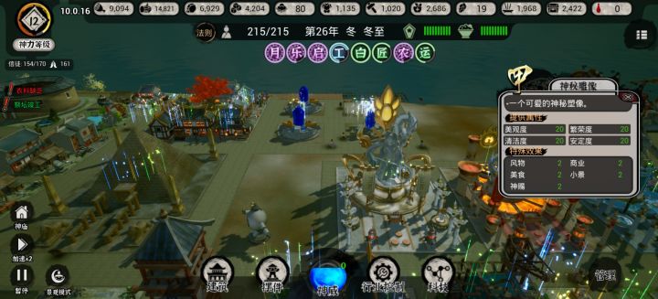 ①开局找个地方放下神庙,游戏正式开始②打开神威,把灵石开采放下来,顺便把空中花园放下来,把创造新人也放下来③造两个10*10的农田,种上小麦④在需要开空地的地方分别造两个伐木场,用神威里面的加速建筑(中)把伐木场瞬秒建好⑤建造住宅,最好规划一下,集中建一个地方⑥等一小会灵石开始开采了,点击科技把书院和仓库研究出来,分别建一个(后期都要补充,先做一个),用神威里面的加速建筑(大)秒建好⑦