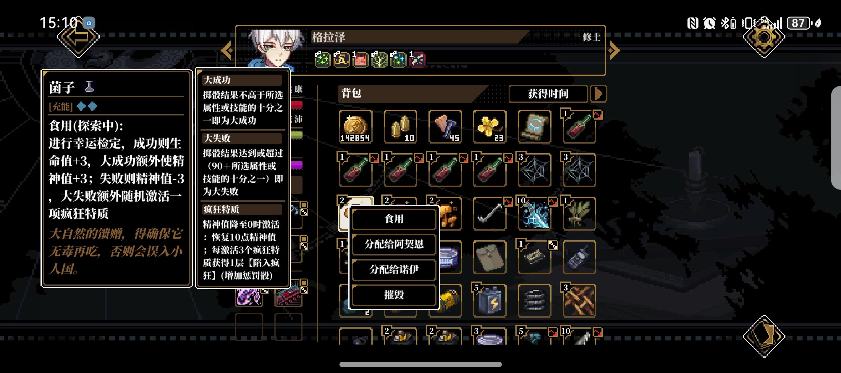 如何在疯狂流打法疯狂特质不够用的情况下快速凑齐5个特质卡镇菌子帮助你!还能顺便刷钱,只需要一个卡达斯之谕,一个数字卡,菌子们,和天降横财如何获得菌子:卡达斯之谕路上顺着捡,能拿到大约16个刷钱……反正吃菌子凑疯狂特质要大失败……燃运搞大失败,运气用光了就反复装备卸下卡达斯之谕刷运(顺便刷钱),数字卡有一个疯狂特质就不会掉精神……永动机!16个菌子诶……凑够五个疯狂特质够够的了