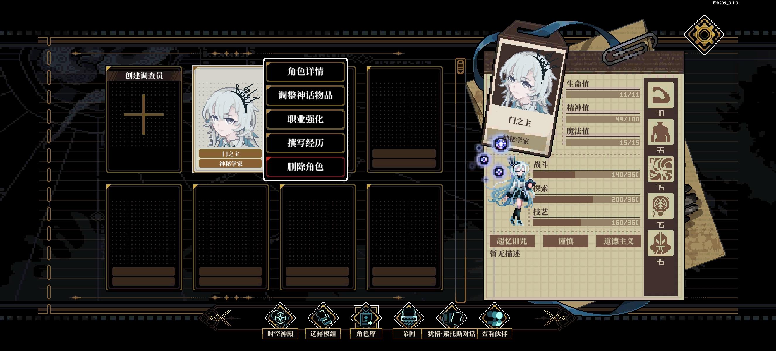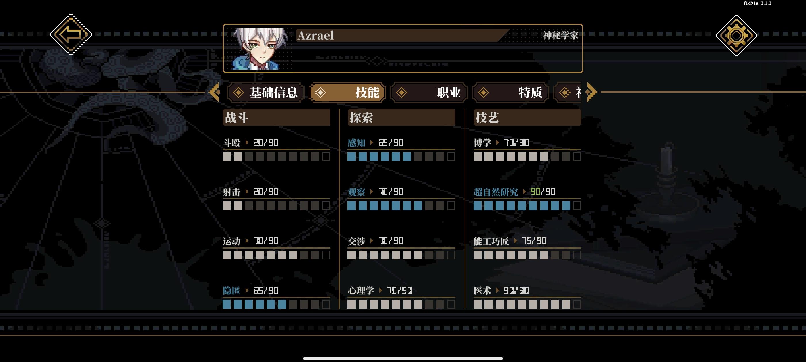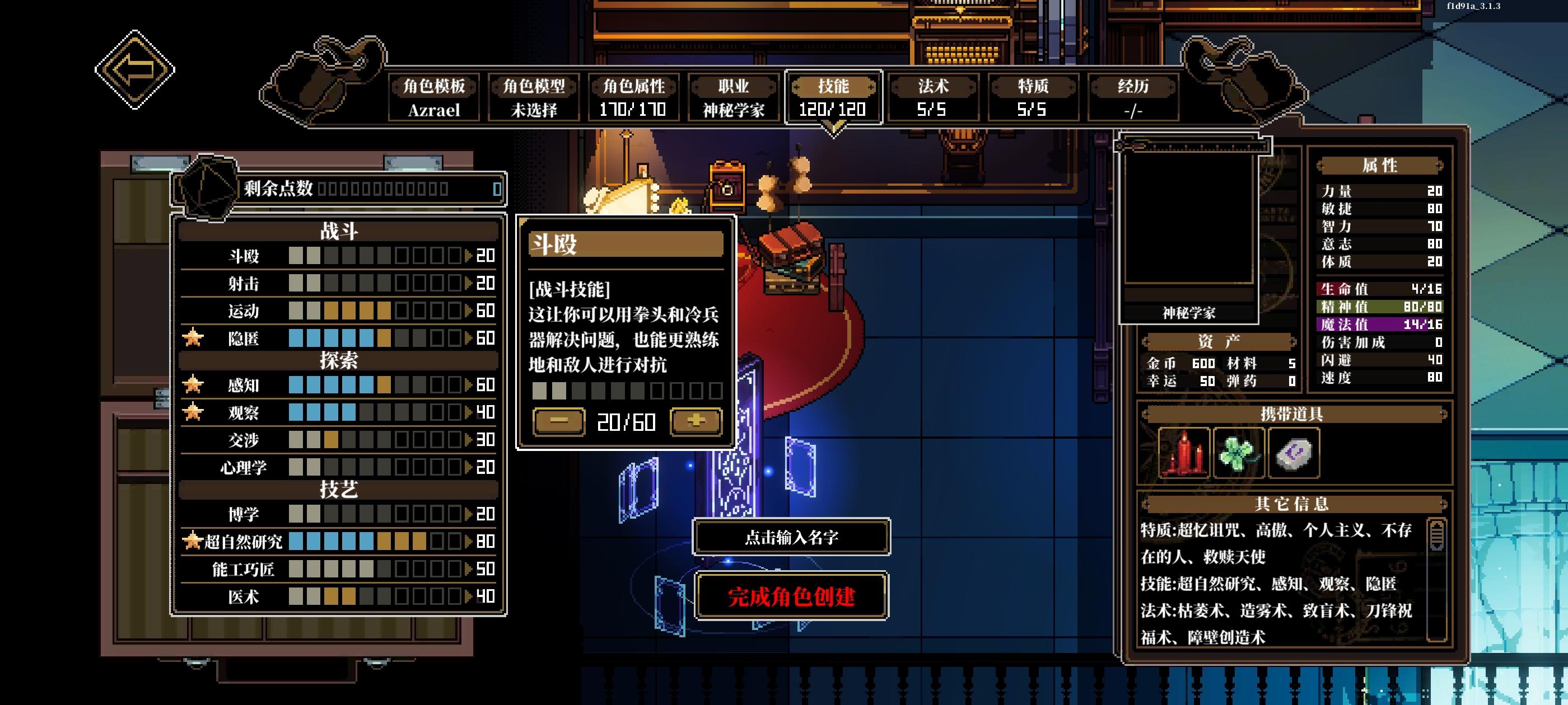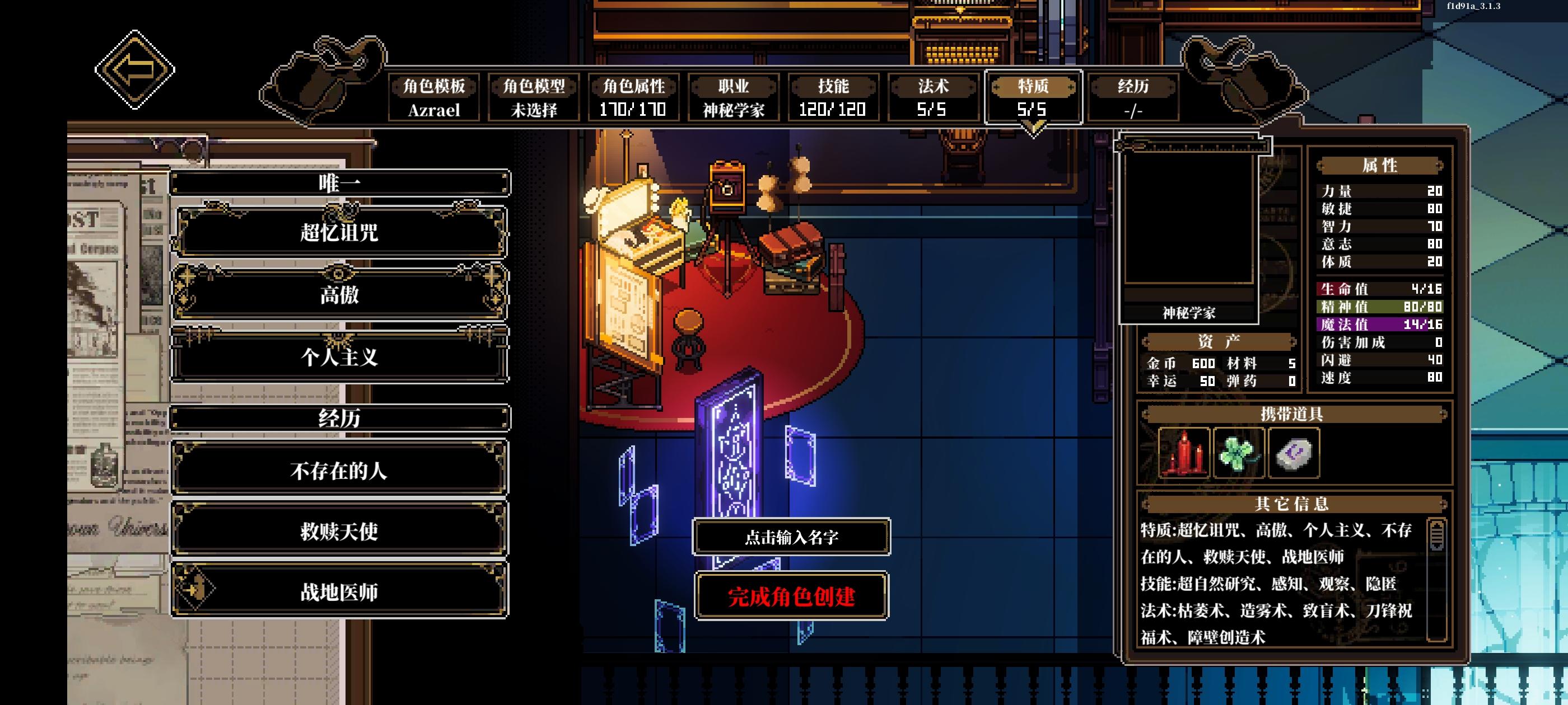 免责声明:本人刚玩三天,初步研究了一下机制,观点仅供参考。说明:以法术作为核心的战斗卡,很容易成型,基本只刷前两个模组就可以。核心属性:速度/智力推荐属性:意志核心技能点:超自然研究推荐技能点:隐匿/感知/运动核心特质:超忆诅咒/不存在的人/救赎天使推荐特质:服食灵药/烈焰崇拜/伤痕累累(睡)可选特质:战地医师/超自然研究亲和/大富豪核心法术:刀锋祝福术/维瑞之印推荐法术:祝福