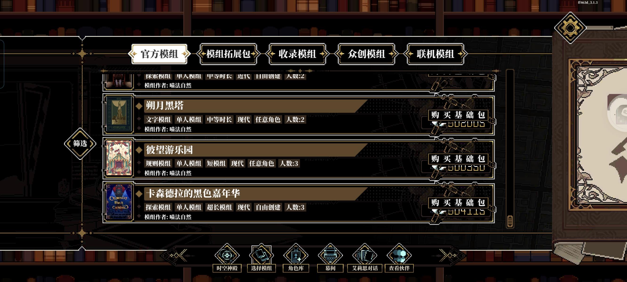 这个按钮可以查看场景中线索,没事就开着,防止漏线索这个按钮可以,在战斗中使用物品,包括丢攻击类道具和用药品,一回合一个人只能使用一次这个按钮可以在战斗中换装备组队这可以调站位加工可以弄道具,有些道具需要能工巧匠判定然后幕间是在这里,然后每次通关模组后获得12格时间,右上角时空点数正在优化中,暂时没用,之前是在转折里面用的度假可以回血,也可以在这里提升属性,不过不能超60研习可以提升技