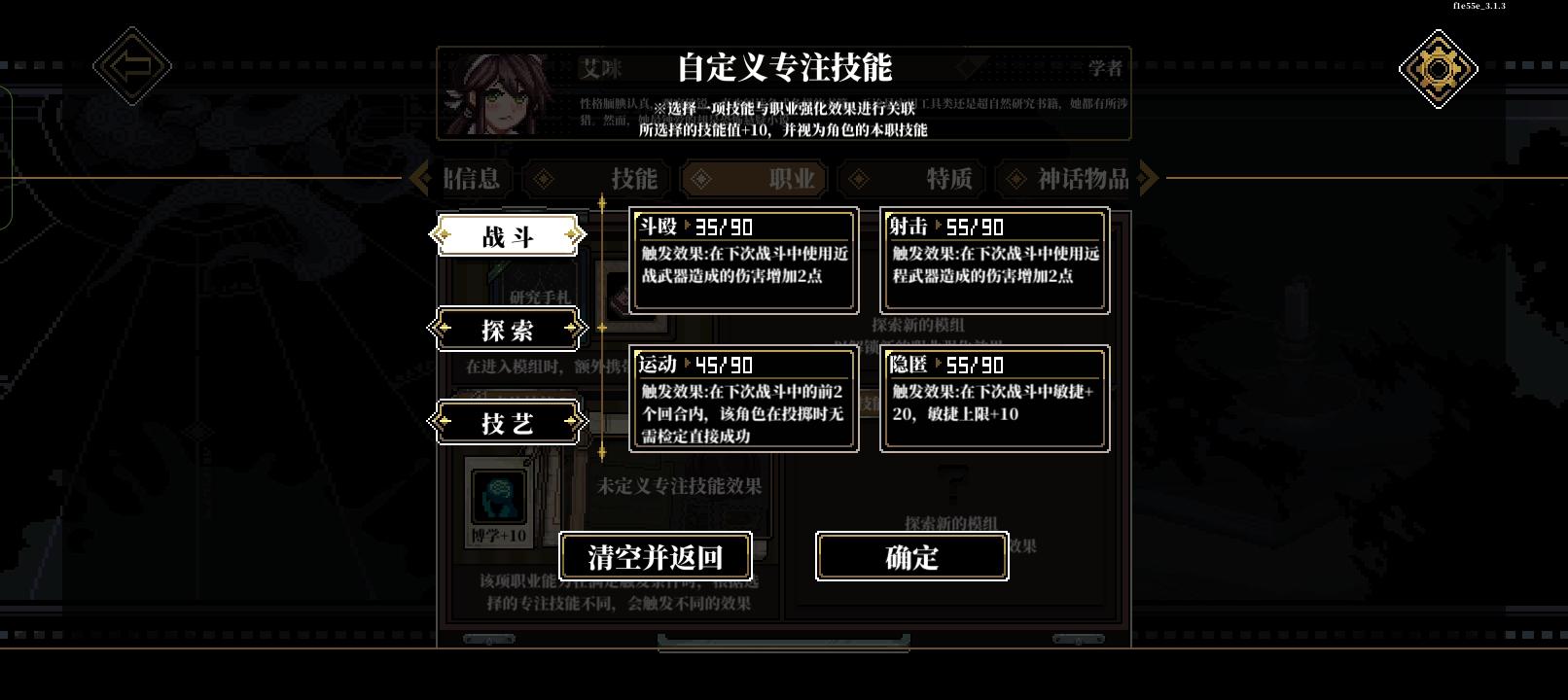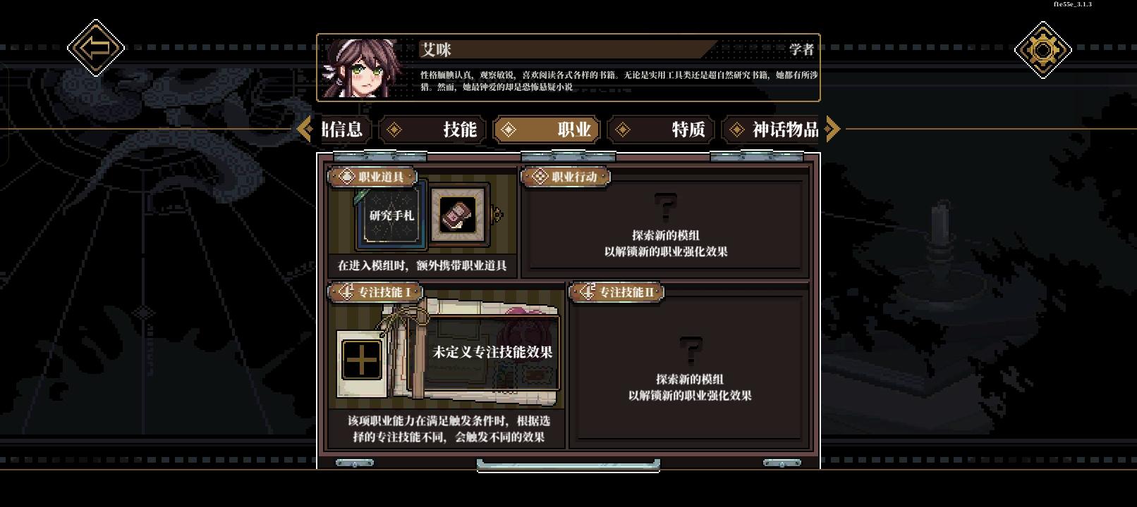 这个按钮可以查看场景中线索,没事就开着,防止漏线索这个按钮可以,在战斗中使用物品,包括丢攻击类道具和用药品,一回合一个人只能使用一次这个按钮可以在战斗中换装备组队这可以调站位加工可以弄道具,有些道具需要能工巧匠判定然后幕间是在这里,然后每次通关模组后获得12格时间,右上角时空点数正在优化中,暂时没用,之前是在转折里面用的度假可以回血,也可以在这里提升属性,不过不能超60研习可以提升技