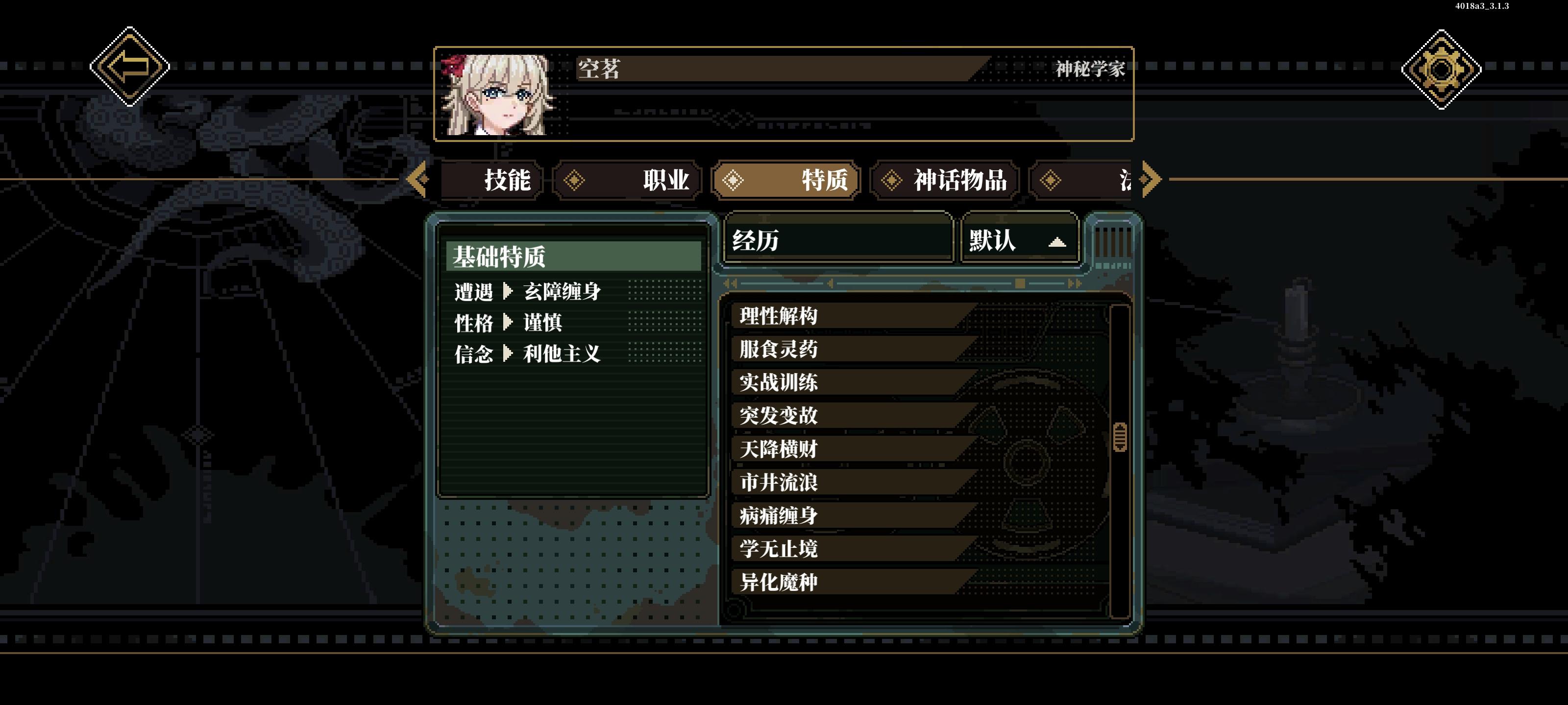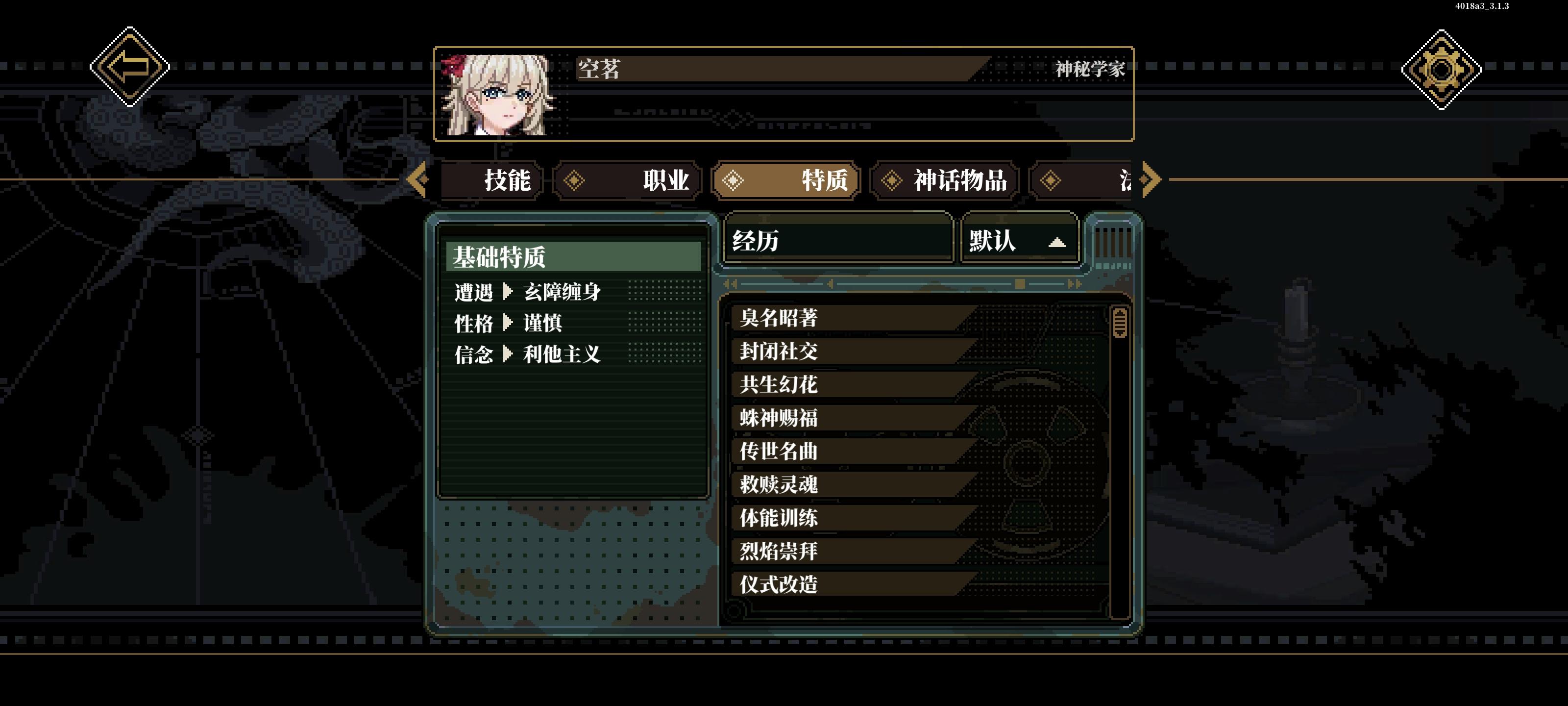 这个按钮可以查看场景中线索,没事就开着,防止漏线索这个按钮可以,在战斗中使用物品,包括丢攻击类道具和用药品,一回合一个人只能使用一次这个按钮可以在战斗中换装备组队这可以调站位加工可以弄道具,有些道具需要能工巧匠判定然后幕间是在这里,然后每次通关模组后获得12格时间,右上角时空点数正在优化中,暂时没用,之前是在转折里面用的度假可以回血,也可以在这里提升属性,不过不能超60研习可以提升技
