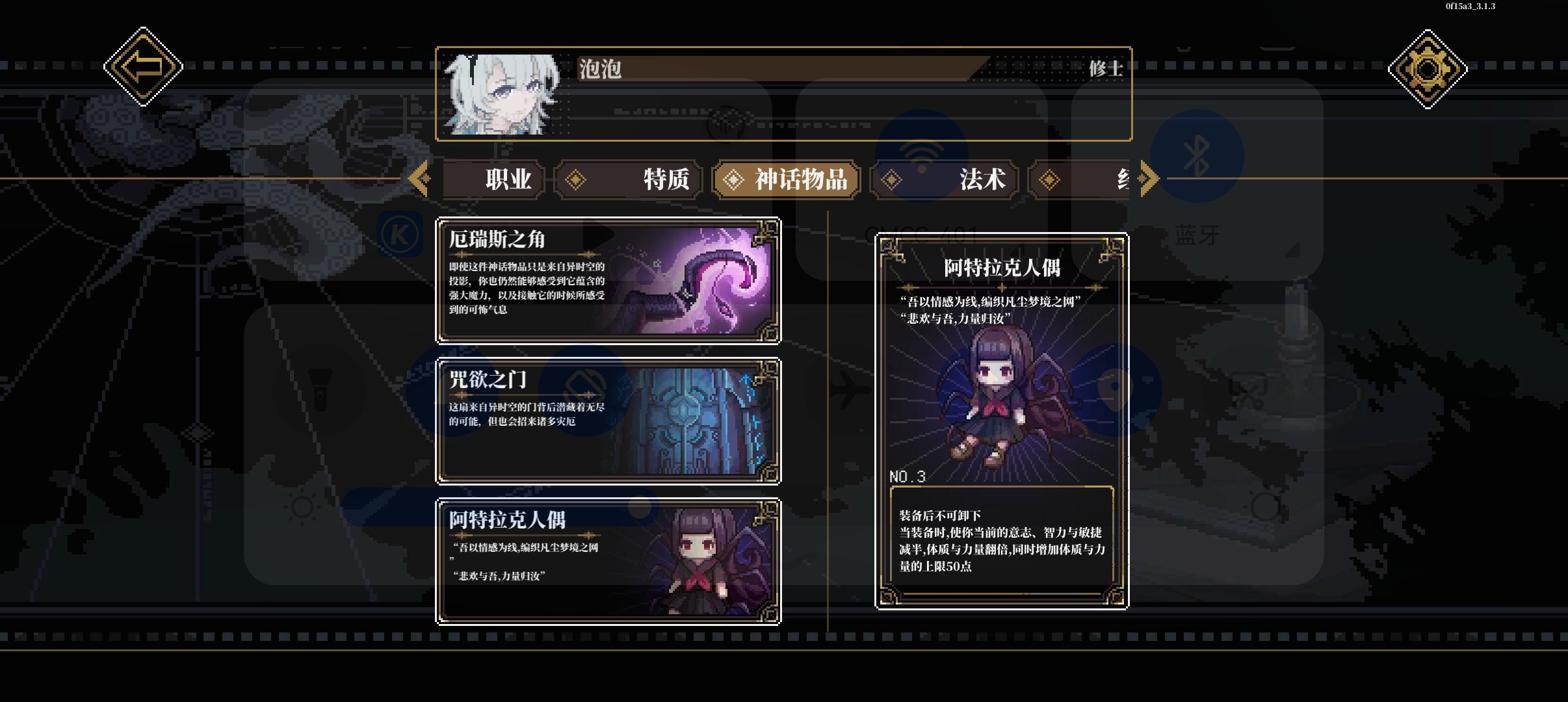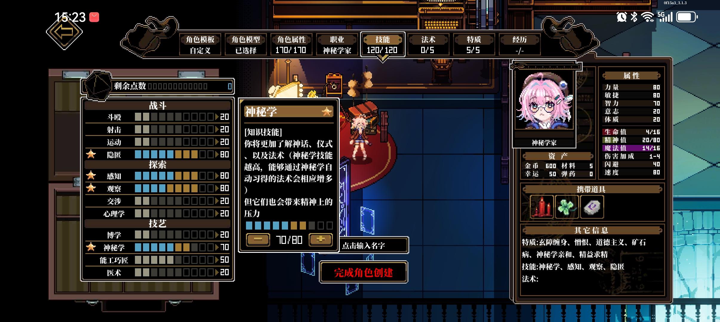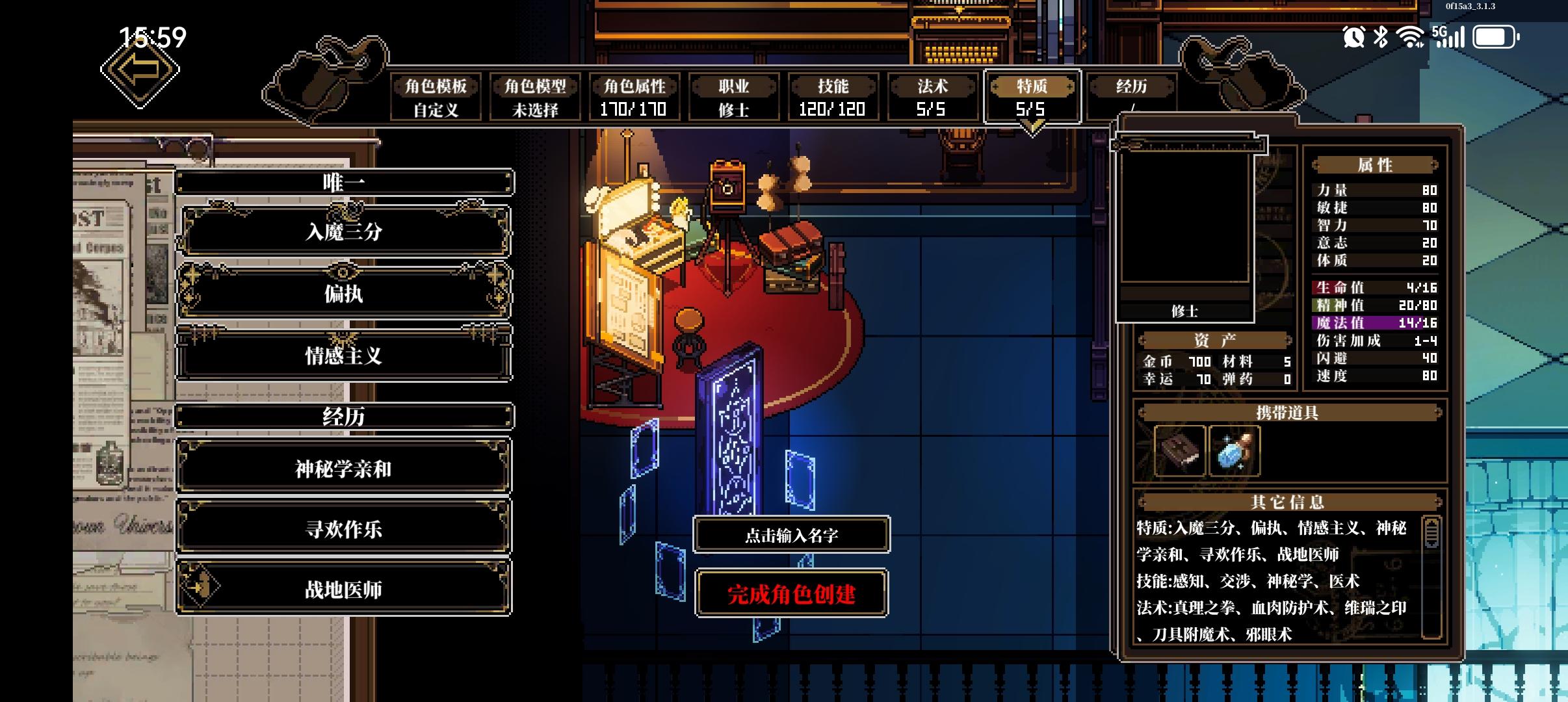 这个按钮可以查看场景中线索,没事就开着,防止漏线索这个按钮可以,在战斗中使用物品,包括丢攻击类道具和用药品,一回合一个人只能使用一次这个按钮可以在战斗中换装备组队这可以调站位加工可以弄道具,有些道具需要能工巧匠判定然后幕间是在这里,然后每次通关模组后获得12格时间,右上角时空点数正在优化中,暂时没用,之前是在转折里面用的度假可以回血,也可以在这里提升属性,不过不能超60研习可以提升技