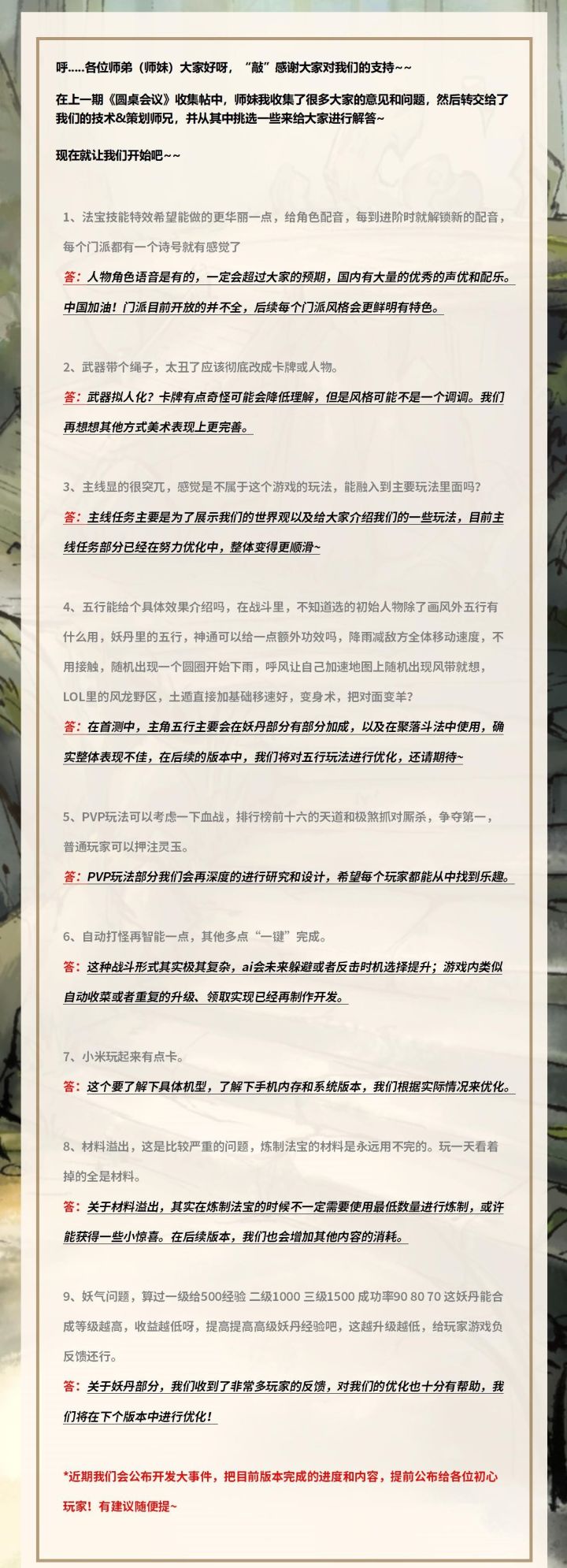 呼......各位师弟(师妹)好,我是你们的师姐~ヾ(✿゚▽゚)ノ咱们的迎春测试,也就是首测已经在2月8日结束啦~在这期间呢,师姐看到了大家提出的建议与意见。(师姐“敲”级赞同的哦!)如:1、玩法较少,希望之后可以推出更多的模式或者玩法。2、希望出挂机玩法、战斗加速。3、希望游戏里面可以有很多互动的社交玩法。4、希望添加打斗画面的加速,法宝的材料获取难度感觉也有点高。5、BUG问题