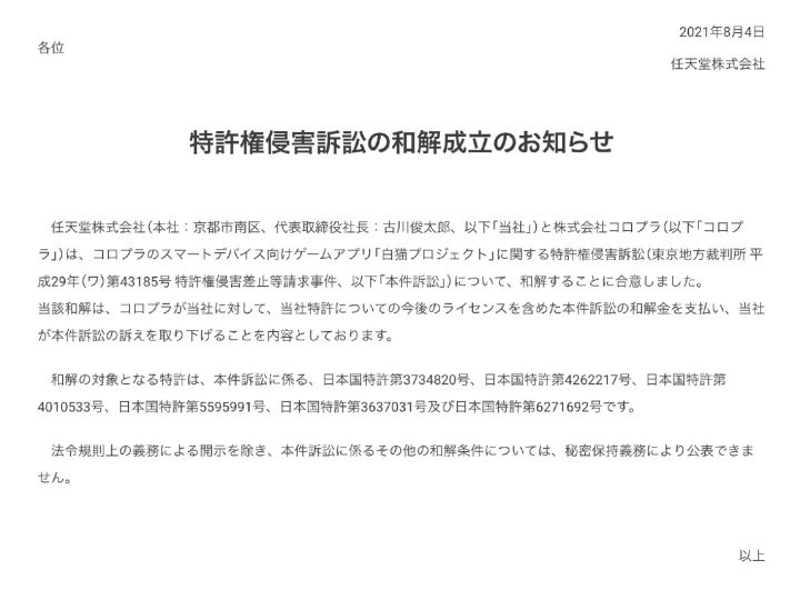 任天堂发布「白猫计划」专利侵权诉讼和解公告。COLOPL将向任天堂支付33亿日元,包括和解费与今后的专利费,任天堂撤回本次诉讼。