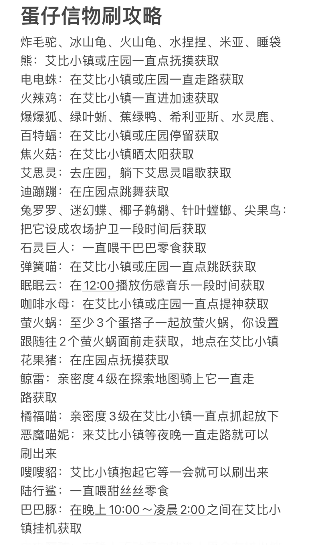 《天树原野》分白天和晚上, 白天是水捏捏,晚上是兔萝萝。 水捏捏刷新点: ①天树瀑布附近②单独浮岛附近。 兔萝萝刷新点: ①天树瀑布附近②唯一刷出哟哟道具石头附近。 《风歌荒漠》 米亚刷新点: ①月亮湖石头旁②流沙坑右边。 《熔心山脉》 爆爆狐刷新点: ①岩浆池②温泉右边③海边孤岛#蛋仔派对
