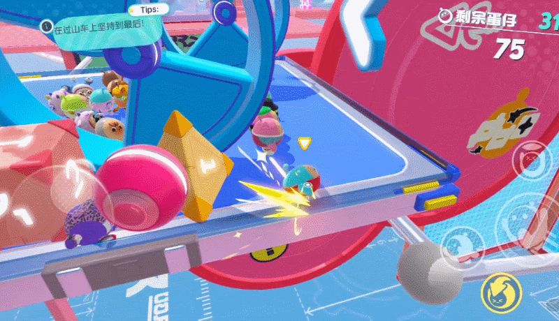这个游戏说简单也简单,说难的话也确实有一些小技巧是需要大家掌握的,随笔者一起了解一下吧~ 除了最基本的跑跳飞扑以外,我们还可以使用一个类似技能的“滚蛋”模式。激活后蛋仔就会变成圆球向前滚动,速度快,可跳跃,但是碰撞后会发生较大的反弹,所以建议大家在障碍物不多的时候使用。比如竞速赛中的直道,或是用于快速通过机关地板。 在某些积分赛中,也可以用于快速涂色块,或是在生存赛中躲避道具,但要有一定的掌控力,