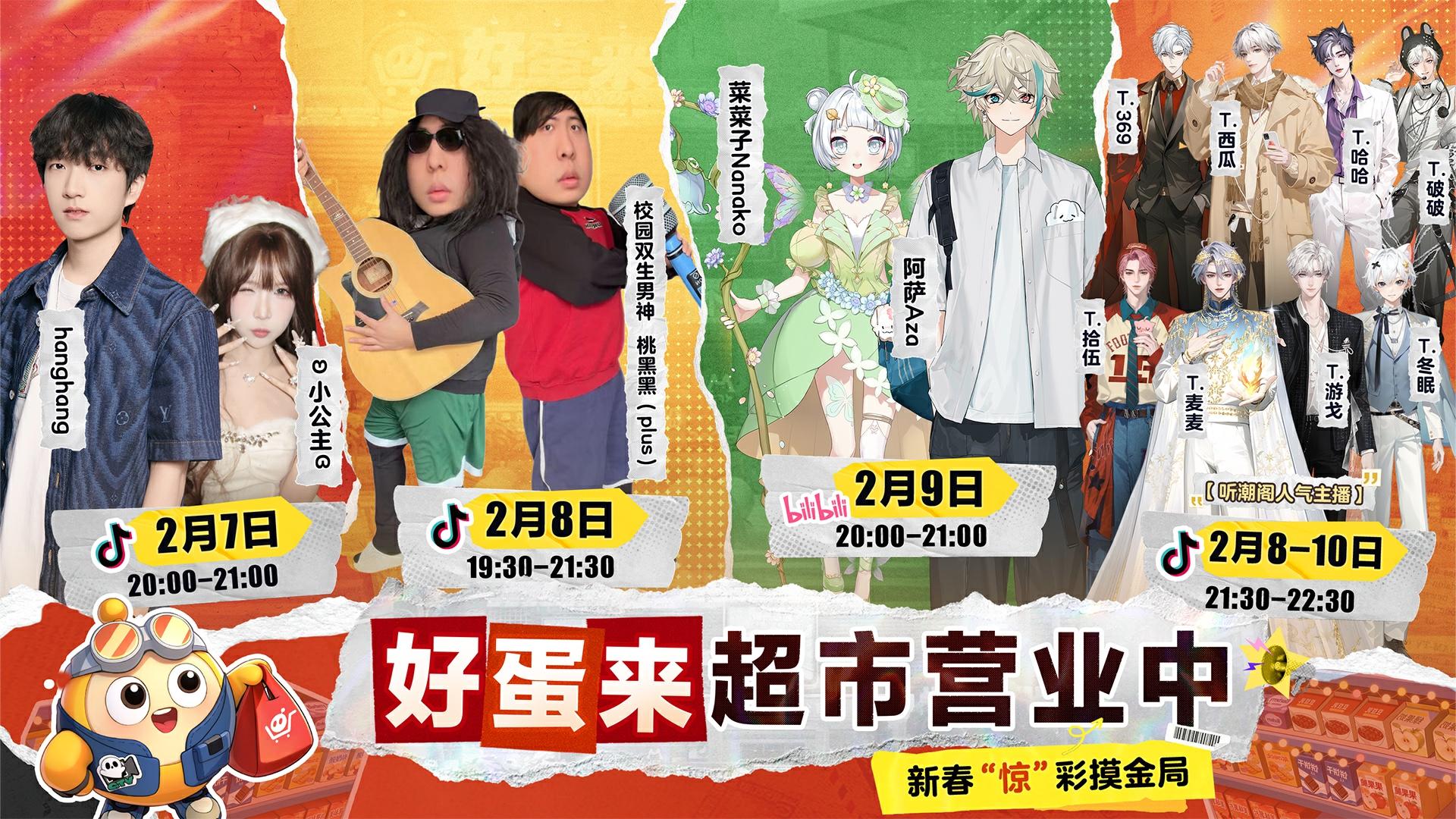 「欢…迎光临…好蛋…来」 「听说…明…星展品…上新…了…」 2月7日至2月10日晚,【欢迎光临好蛋来】线上开业爆金夜开启![表情_开心] 游戏甜菜cp、校园双生男神、新老百大UP主、听潮阁人气主播, [表情_期待]四组好蛋来超市明星导购蛋将线上直播体验惊魂寻宝队全新副本*好蛋来超市*! ★锁定明星导购蛋直播间,围观直播领惊喜福利: -前往直播间,在弹幕输入蛋仔ID或与明星导购蛋