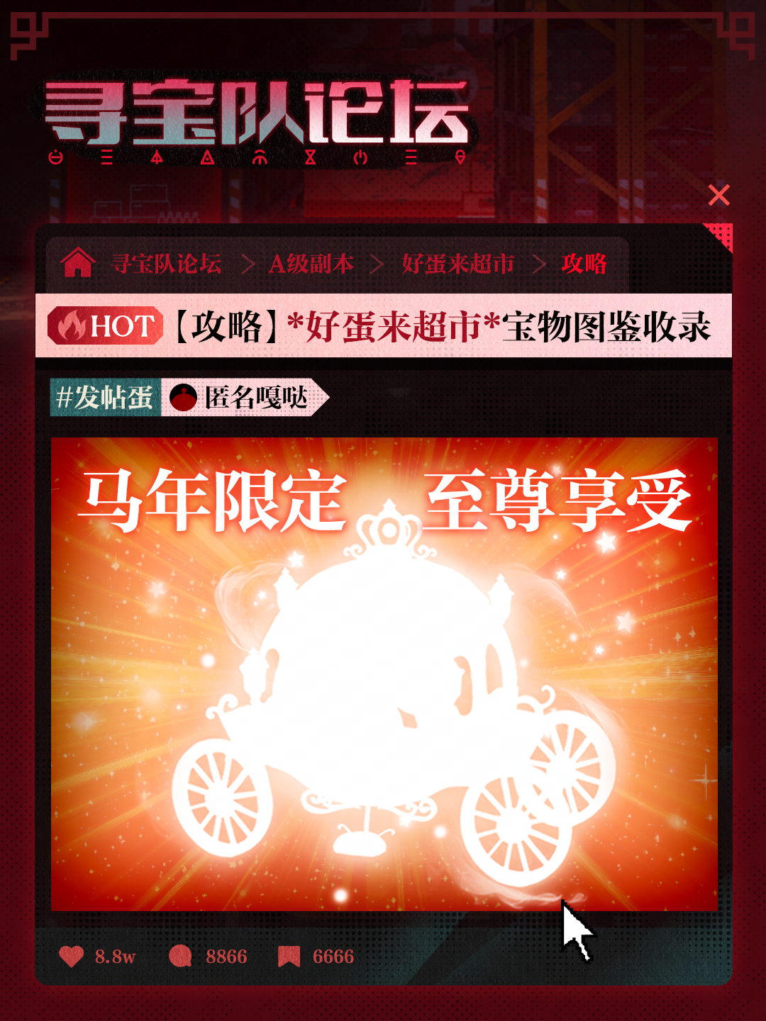 「喂——喂!我是威猛麦克。插播一则......听起来很妙的通知!」 「春节就要买年货,过大年!你们运气不错,福利副本*好蛋来超市*今儿开张。」 「说是什么100%安全、100%顾客好评,商品便宜得跟不要钱似的......」 「但记住:午夜12点前必须出来。」 「好了,通知完毕。快去快回,千万别——贪——心——」 ———— 2月6日,惊魂寻宝队全新副本*好蛋来超市*即将开放![表情_期待]